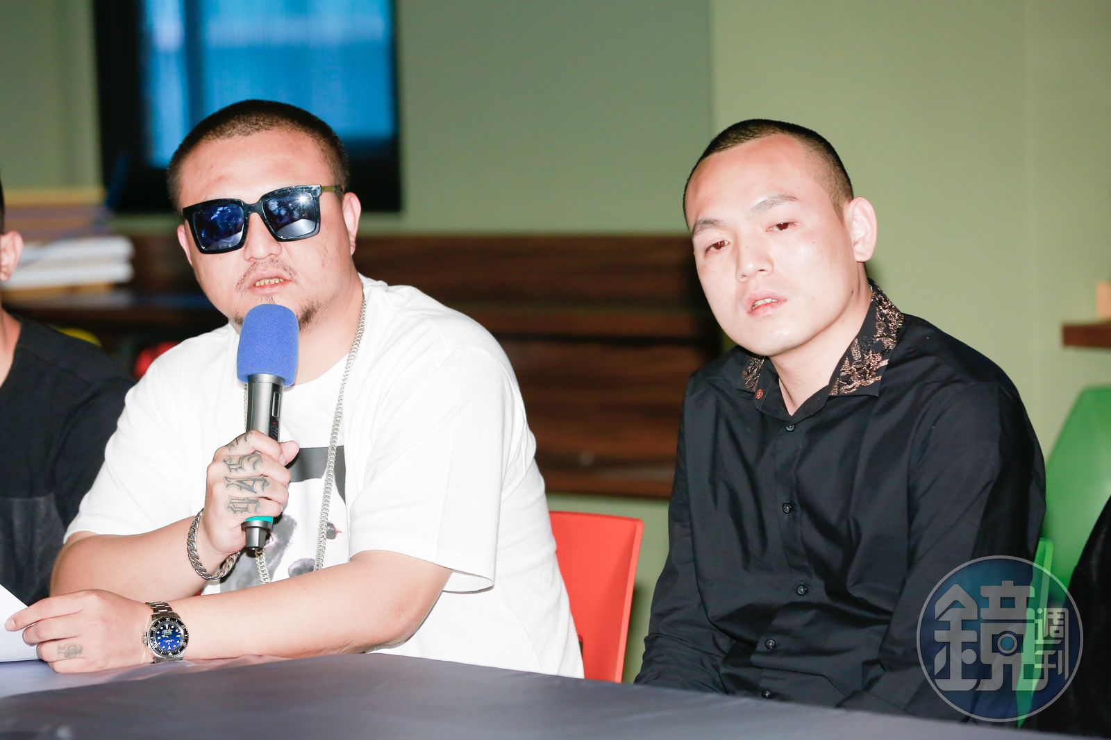 整場記者會由混血兒娛樂蕭老闆(左)代為發言,春風一臉嚴肅,或是低頭、或是苦笑,偶爾抖腿,似乎想掩蓋心裡情緒起伏。發布時間:2017.04.06 18:14 臺北時間