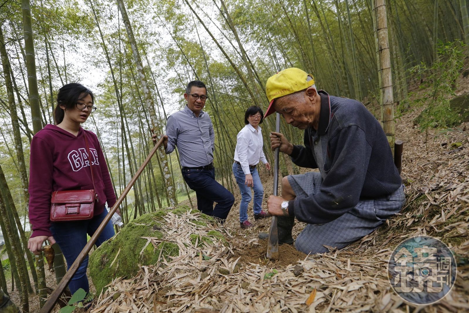 林俊賢感性表示:「竹子就像我的另類父母,從小我就喜歡細心辨識各種竹子特性,看多了自然就懂。」有趣的是,儘管林俊賢說得一口好筍,但真正造訪竹林挖筍時,還是得仰賴經驗老道的父親,面對坡度約45度山坡林,眾人幾乎都站不穩、頻頻滑倒,只有高齡90歲的林爸爸手拿鋤頭、腰間在插把鐮刀,依舊步伐穩健。