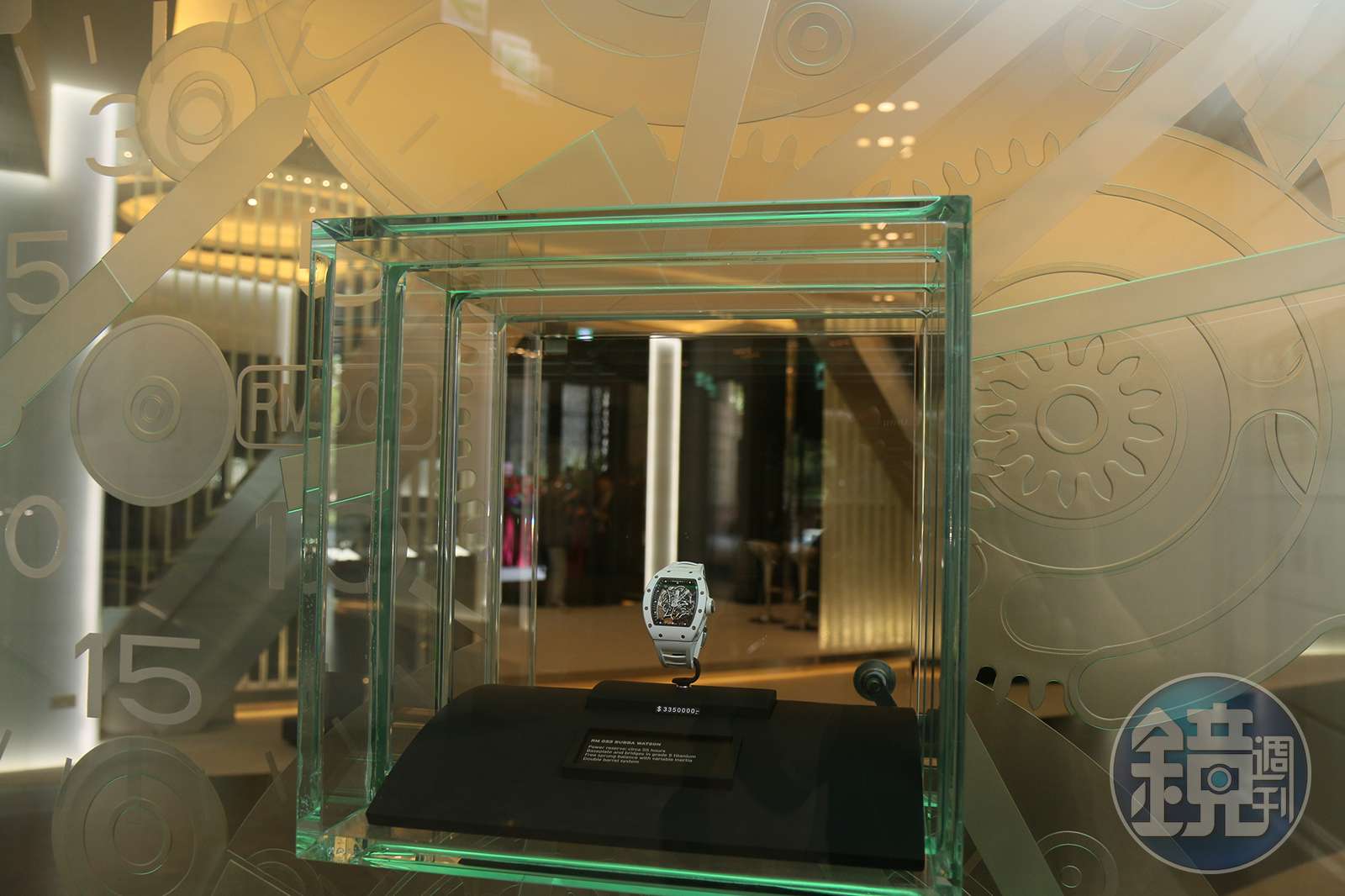 大門上方的大型頂幕是採用四層強化玻璃雕刻出經典錶款RM033 的錶面圖案,透過層層堆疊及照明的方式,為店裡創造出透視、深度,以及程度不一的透明感。除此之外,「機芯圖案裝飾」也被大量運用在店內,象徵著RICHARD MILLE最引以為傲的複雜技術。
