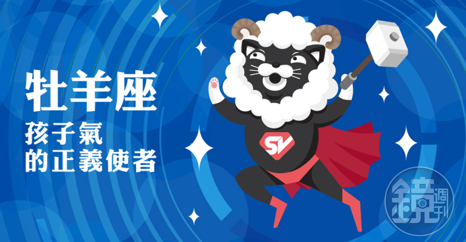 坦率、活潑開朗的牡羊座還有著一顆赤子之心,有時候會突然冒出一些幼稚的舉動,展現孩子氣的一面。而沒什麼心機的牡羊座亦相當富有正義感,喜歡幫助弱者,是正義使者的化身。