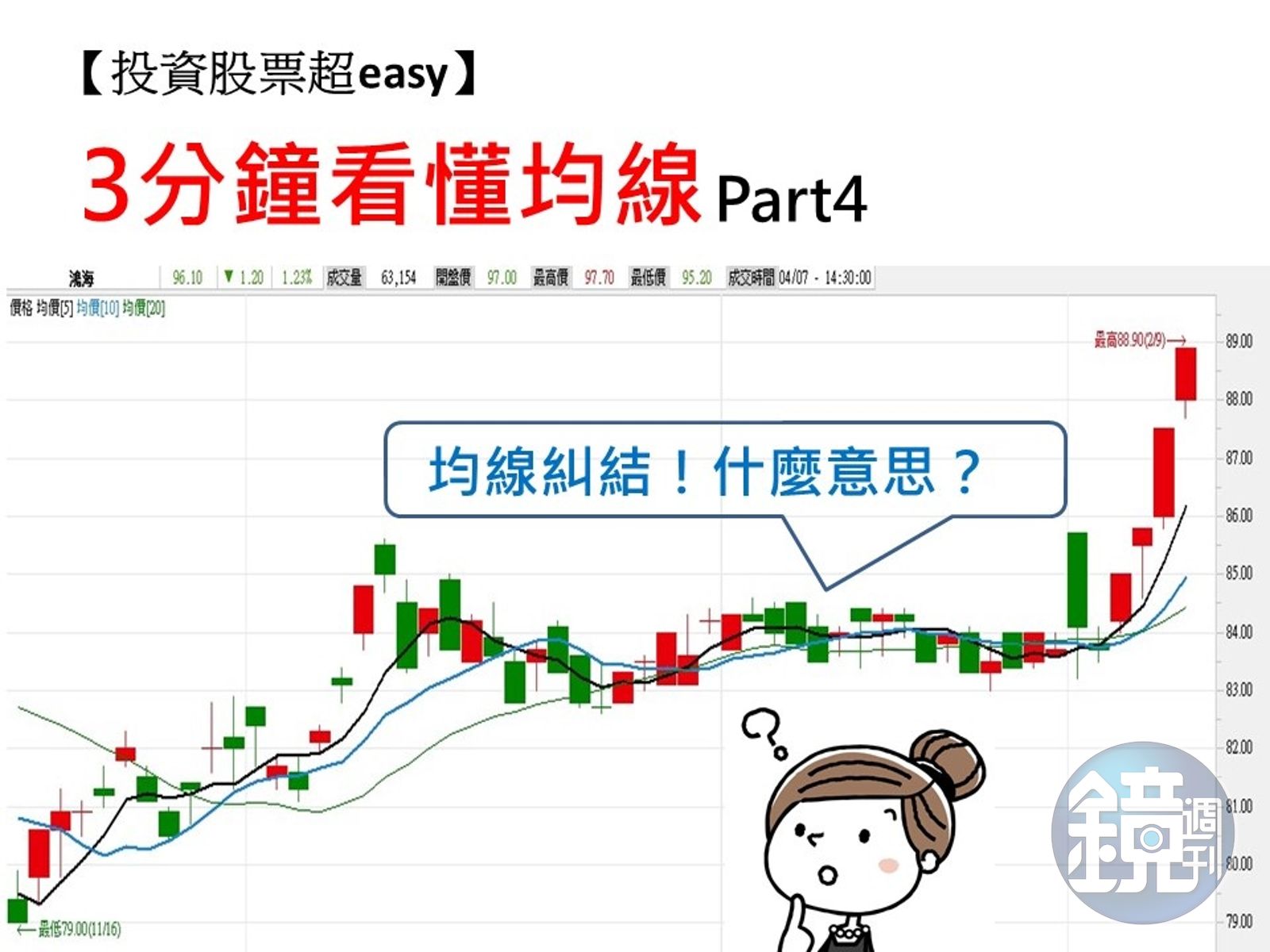均線,代表一段時間內,投資人買入股票的「平均成本」,因此,當長、中、短期均線糾結在一塊時,表示不論是長天期或短天期的投資人,他們持有該檔股票的成本相當接近。另一層的意義即是,後續漲跌方向難捉模。 既然糾結的背後意義是多空不明,當然要等多空其中一方表態,也就是股價有明顯漲跌、趨勢出現時,再做進出場決策。現在就跟著我們看圖例,輕鬆學會均線糾結的判讀訣竅!