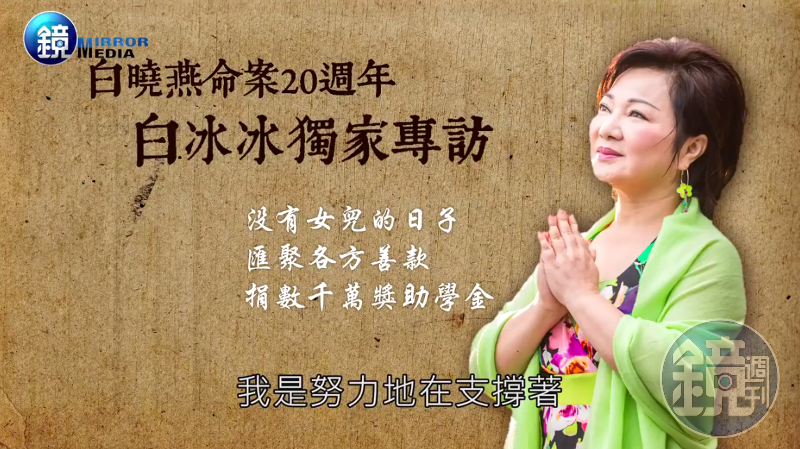 白冰冰接受本刊採訪時提到,總有人說她提白曉燕來炒新聞,她自問自答地用輕柔的語氣說:「在我老死之前,我都會一直提她、一直想念她,別忘了這是我唯一的權利」,言語中透露出她身為人母的不捨和無奈的釋然。
