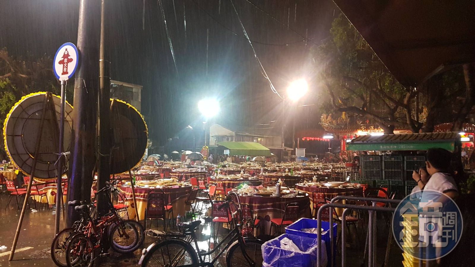 這場平安宴是在11日晚間開場,賓客回憶說,當時天空就已經烏雲密布,沒想到才吃到第三道菜,天空突然下起滂沱大雨,信眾打趣說,剛好第三道菜是魚翅羹湯,只見湯越喝越多,味道越來越淡,因為全都是雨水。 由於瞬間雨勢非常大,信眾只好紛紛走避到廟前樹下或屋簷躲雨,只剩下舞台上表演節目的歌手,相當敬業地冒雨表演,這場席開60桌的神明誕辰宴,遇上雨神攪局,全都泡在水裡,還好信眾認為南部久逢甘霖,這是好現象,也都不以為意。