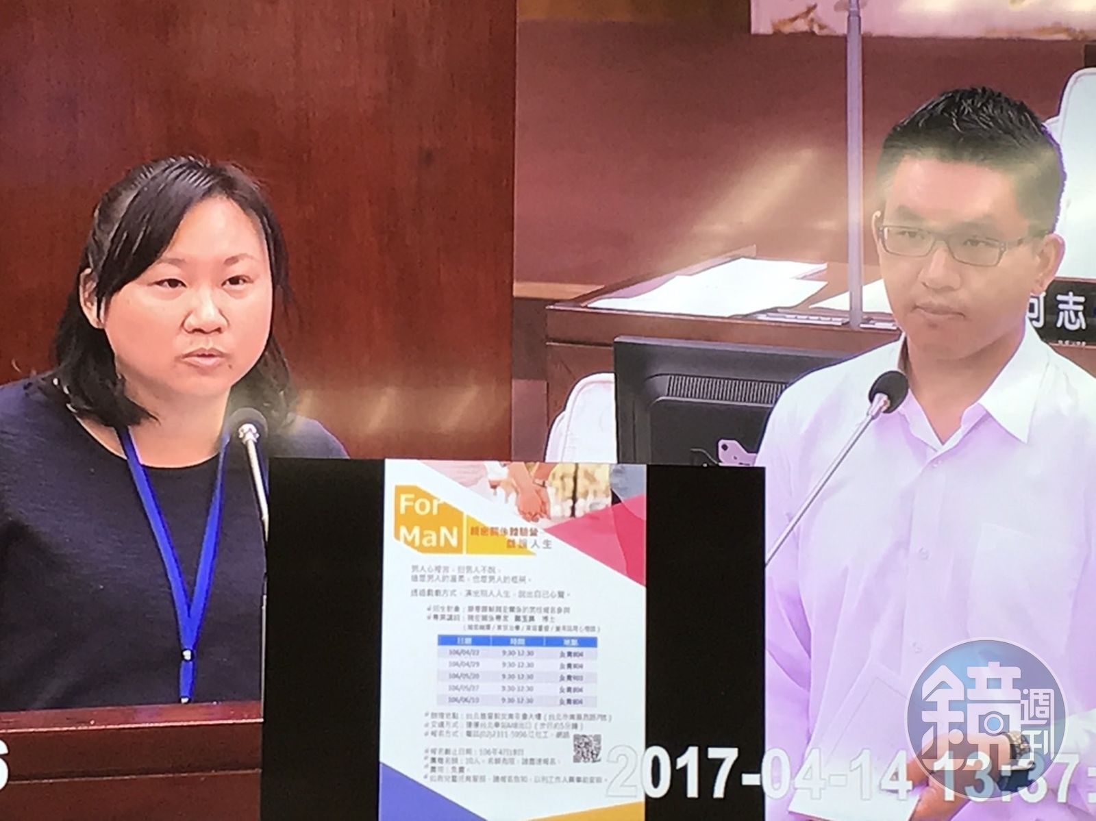 今年初爆出毆打妻子李秀環的台北市議員童仲彥(圖右),在議會質詢家暴議題,遭家暴防治中心副主任陳彥竹(圖左)回:「議員可以主動要求我們服務」。發布時間:2017.04.14 15:01 臺北時間