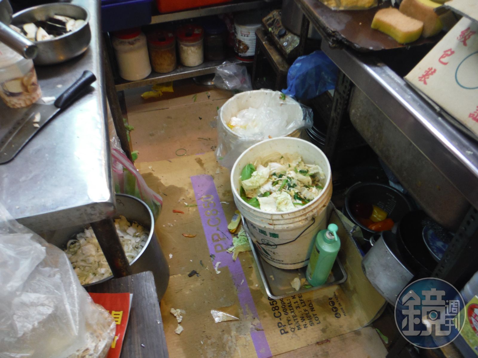 除了使用廢棄蔬菜,讓消費者吃下肚之外,八麵玲瓏還將食材醬料放地上,衛生堪慮,工作檯面也是髒污不潔;而韓濟小火鍋則是調味料罐外觀和地板都不乾淨,看來十分髒亂。