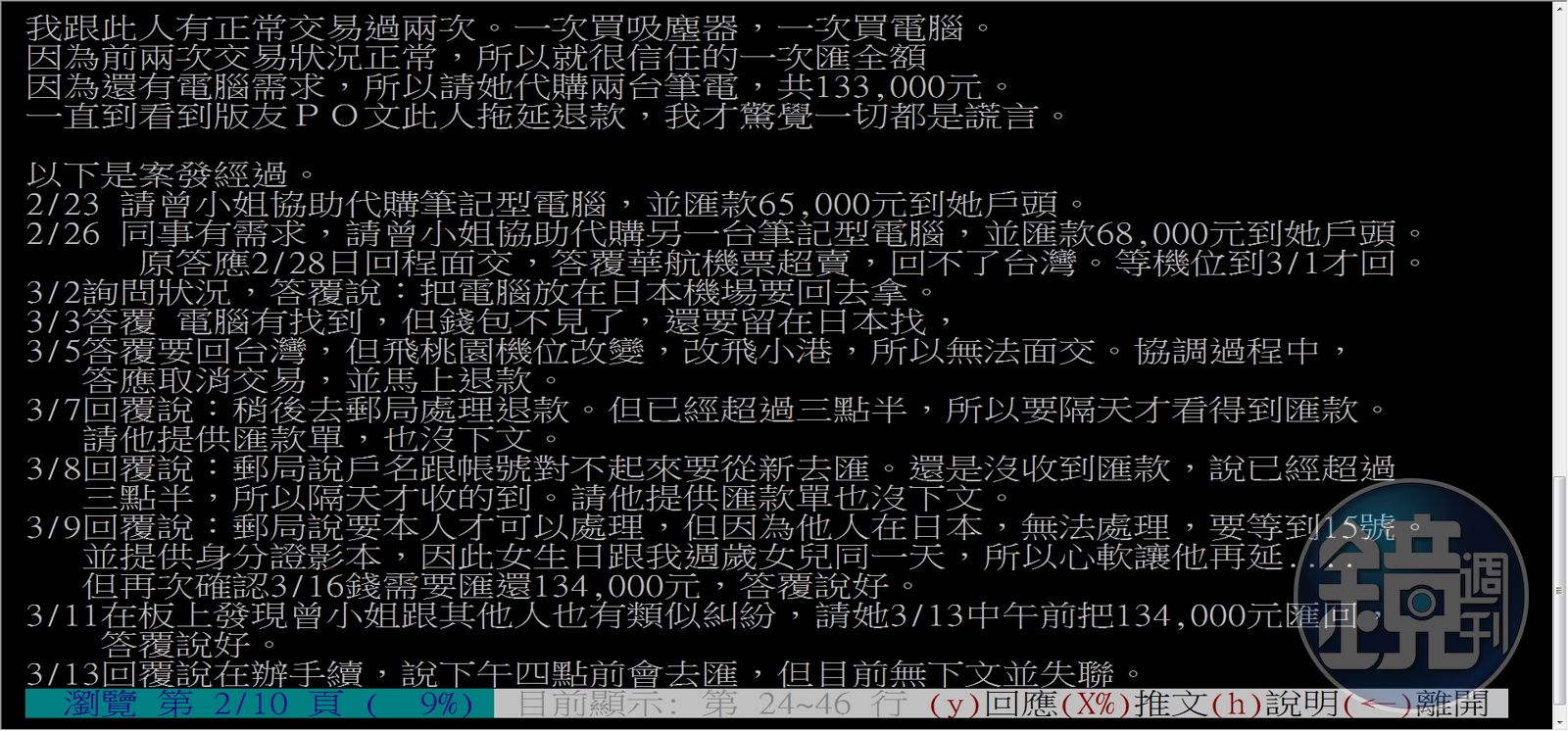 曾女先是利用LINE等通訊軟體,要求買家匯款,待匯款後,曾女再假借貨物運送延遲,或日本目前缺貨等理由,拖延買家。若買家要求退款,曾女則直接神隱並斷絕聯繫,造成32人因此受害,而紛紛向警方檢舉。