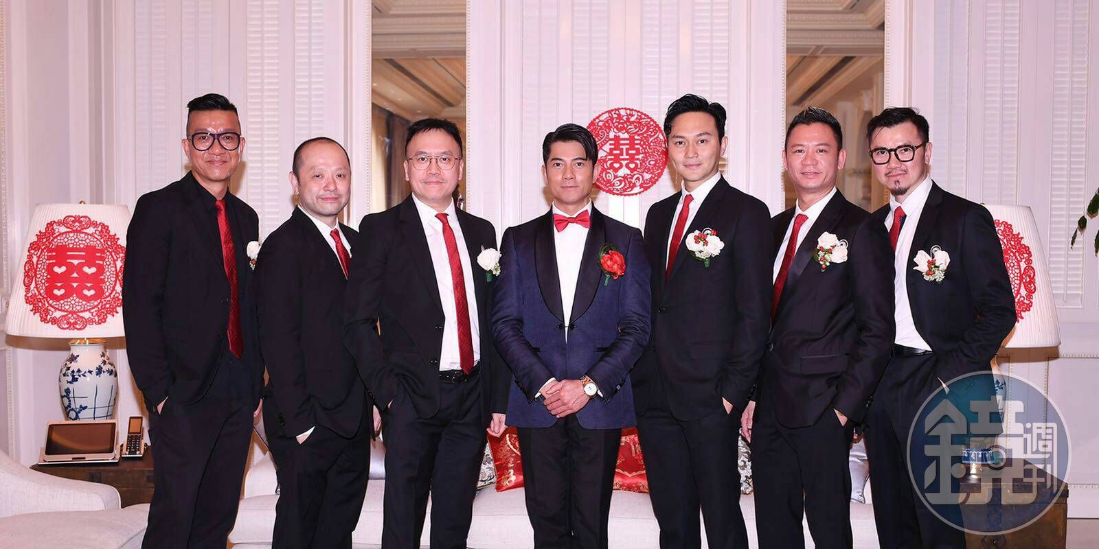 郭富城與友人在婚禮上合影,左起譚國政、沈嘉偉、圈外朋友、城城、Chi lam、sunny 、jack(演出唱會監製)。發布時間:2017.04.18 19:09 臺北時間