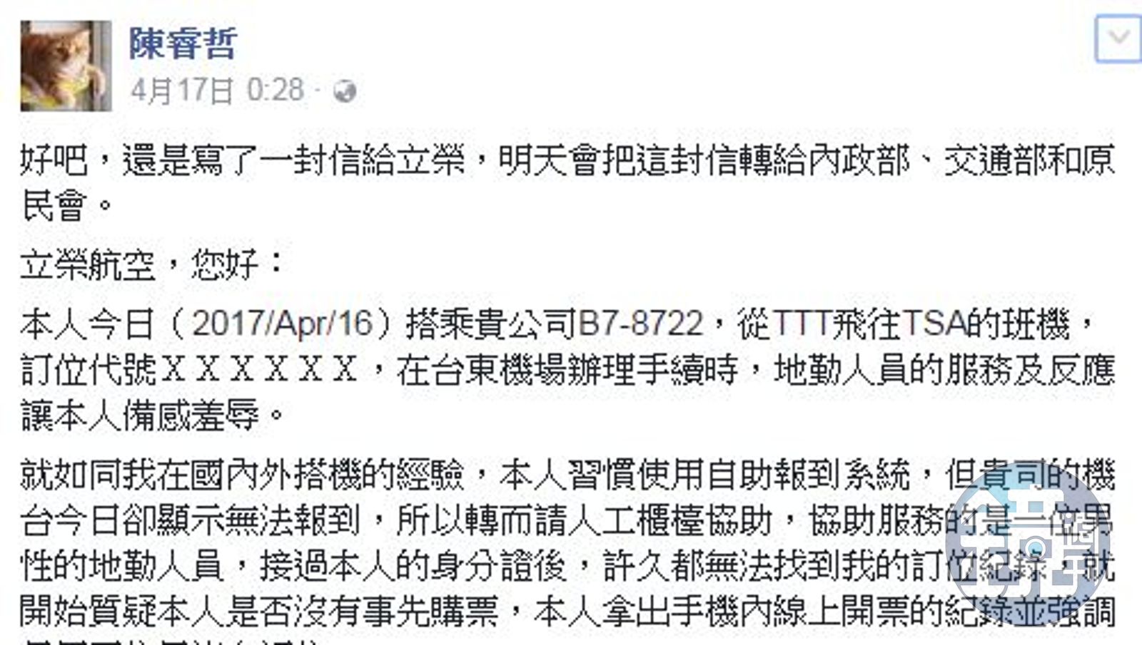 這名台大新研所的學生,在網路上寫了一封「給立榮航空的公開信」,陳述事件始末。他說自己16日當天,在台東機場預計搭乘立榮航空B7-8722班機前往松山,他解釋自己本來都習慣用自助報到系統,但航空公司的機台卻顯示「無法報到」,他才轉而到櫃台「人工報到」。