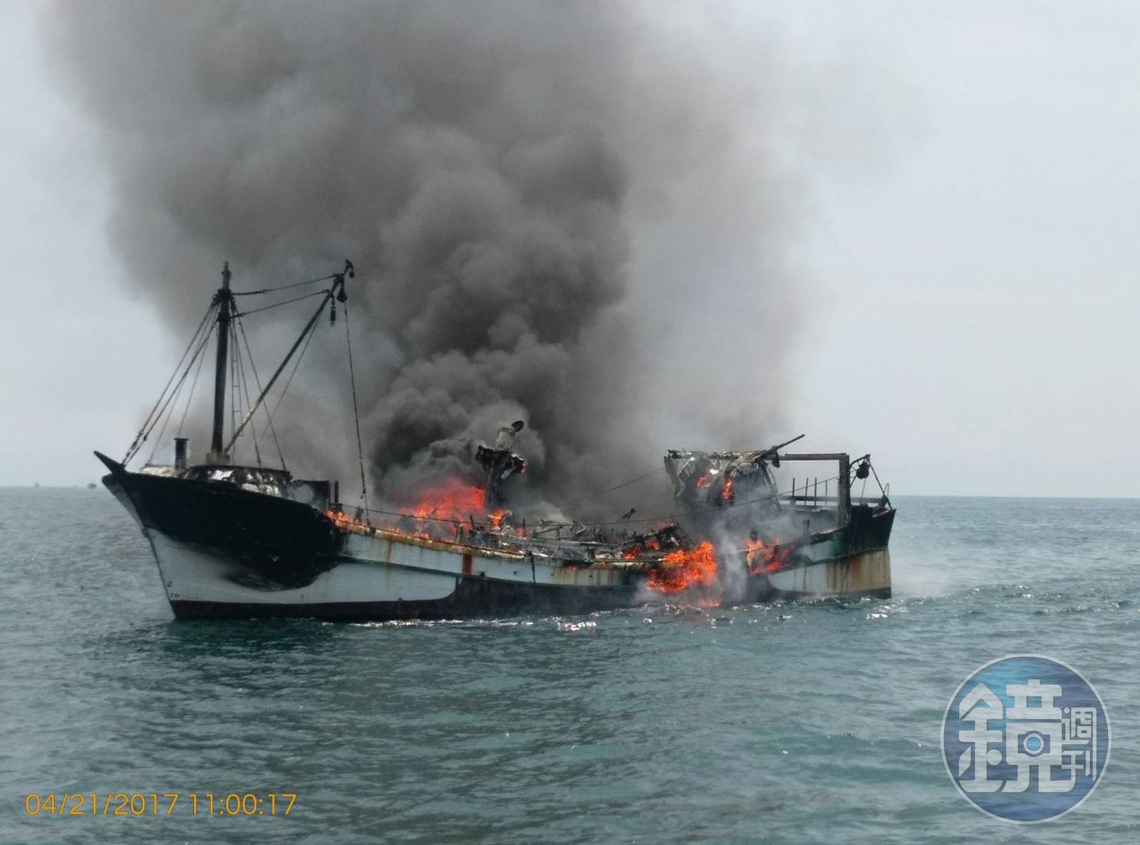 早上10點多,海巡接獲通報,有1艘漁船在海上發生火警,海巡單位立即派出艦艇前往滅火,一出海就發現這艘冒著濃煙的漁船,靠近時漁船已經幾乎燒個精光,由於情資顯示,船上有1名船長還有3名漁工,海巡艦艇一邊滅火,一邊尋找船上人員,幸好四人皆已跳船逃生。