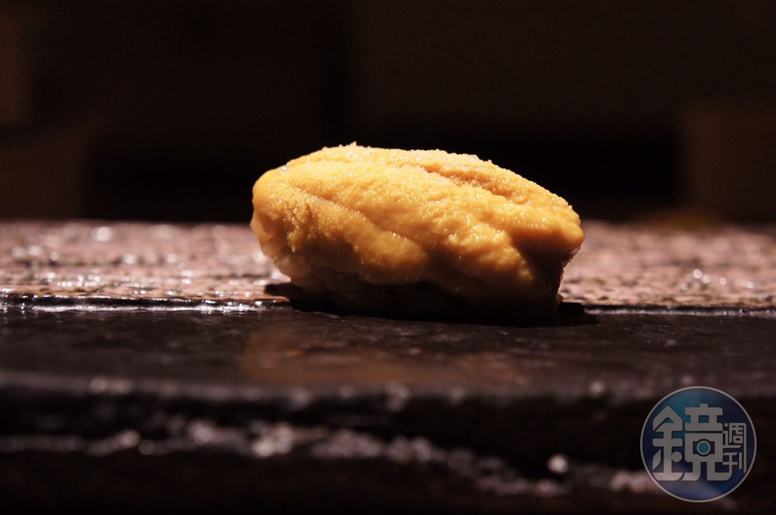 我在中場吃到「生熟赤海膽軍艦」和「紫海膽握壽司」時,更確認了他對於握壽司的食材、溫度及組合平衡感的掌握度,選用半生半熟的赤海膽組成的軍艦,被酥脆海苔包圍的黃色海膽鮮透順滑,食材和醋飯一起入口微溫順口,又香又脆的海苔也相當迷人; 就當大家還沉浸在滿足之際,佐藤博之緊接再追加一貫「紫海膽握壽司」,這一口海潮味道更狂野,不同種類海膽,在佐藤博之的詮釋下,極力展現鮮腴通透的魅力。