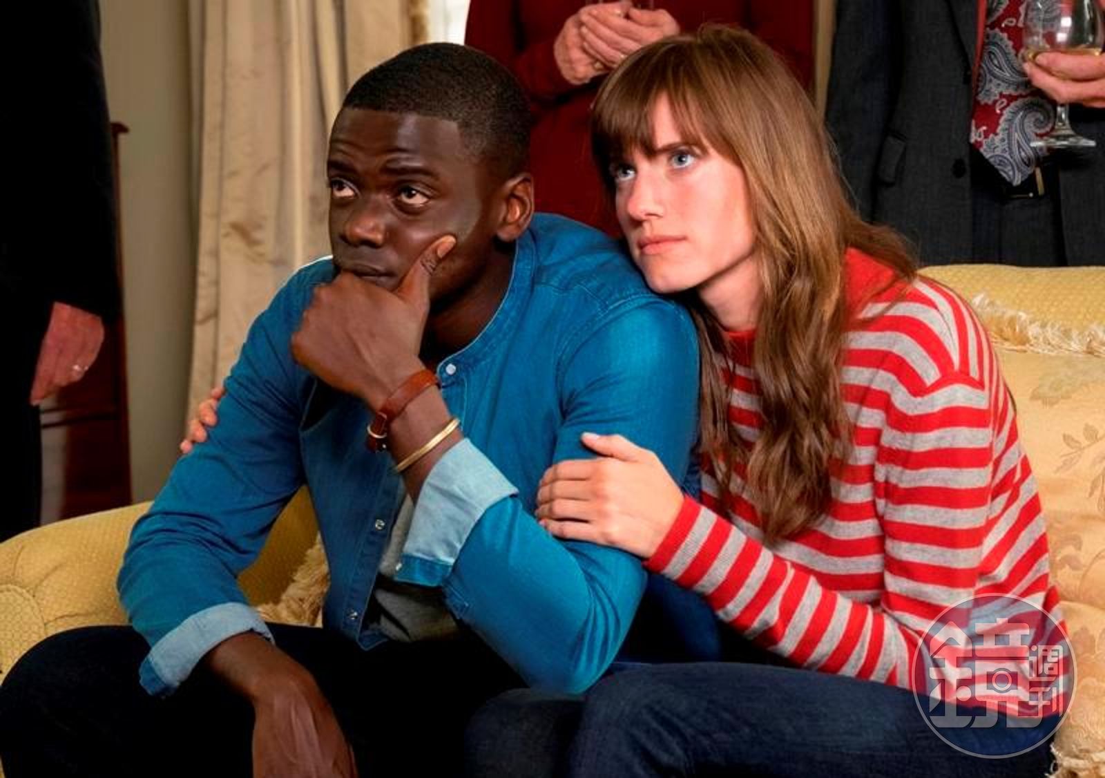 男主角的種族敏感度,讓他漸漸開始警覺到這空間中的危險。種族衝突的主題,可以被描述得很隱喻,但是這部片以一場「黑白大對決」的戲,把美國黑白種族的權力不平等,進一步地視覺體現。片中一場戶外派對,黑人男主角好像一隻誤入叢林的小白兔,陷身在眾多白種賓客當中,構圖刻意誇張了黑白膚色/數量的對比,讓畫面中的黑人男友處在危險孤立的狀態,彷彿進入一個噩夢。很有趣的是,派對上的「白種族群」,除了清一色白種中老年之外,還有一個「亞裔代表」,似乎在暗示亞裔族群在美國社會的變遷,從一個被陰性化邊緣化的族群,「晉升」到可以和主流白人一起剝削少數。