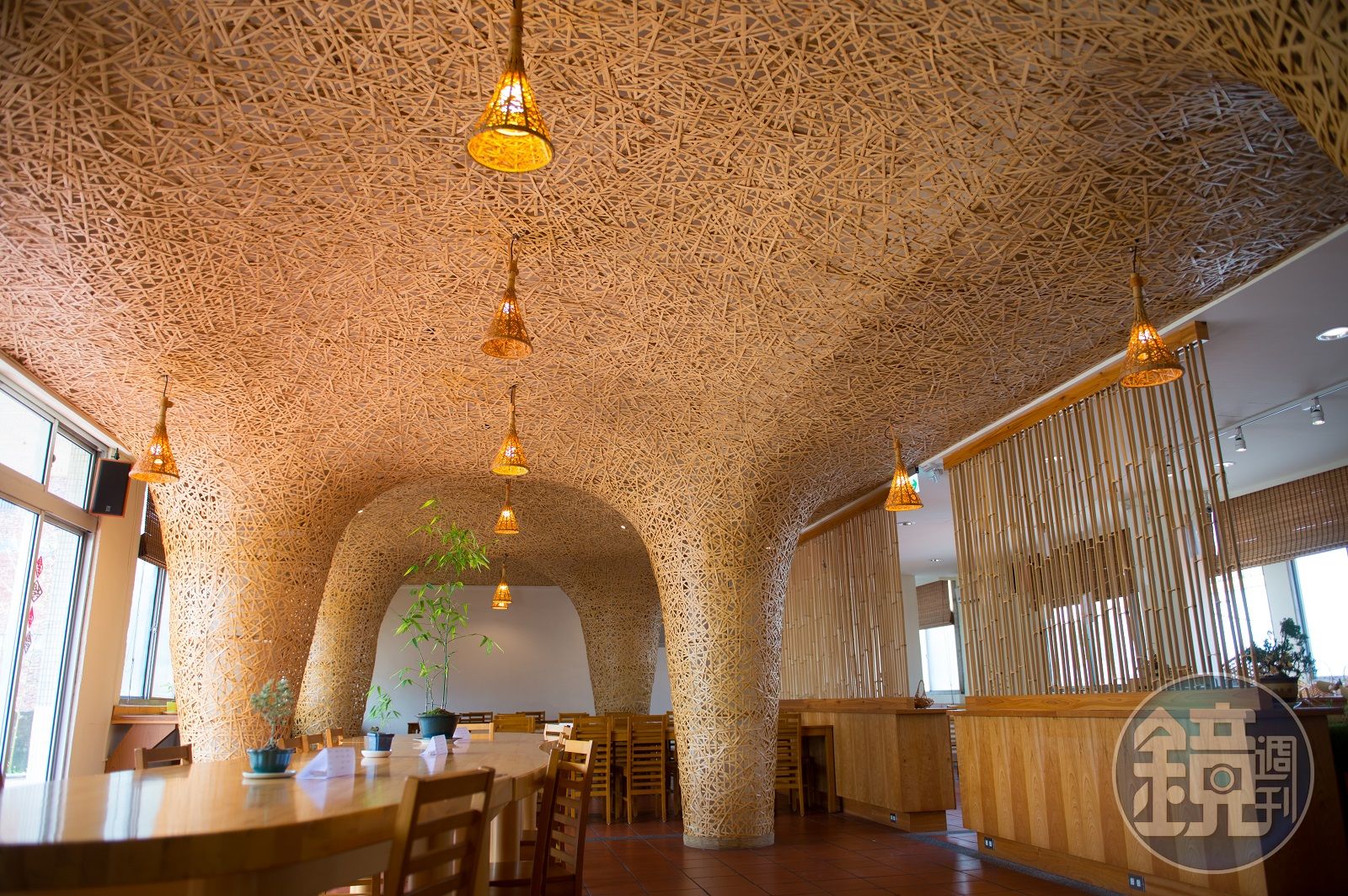 走上二樓,推開門,整個空間好像被竹子編織起來,工藝家蘇素任選擇用5,500條的竹山竹片,與團隊人員一條條構築,以竹子本身的「雅」、竹編的「細膩」來打造不凡空間。