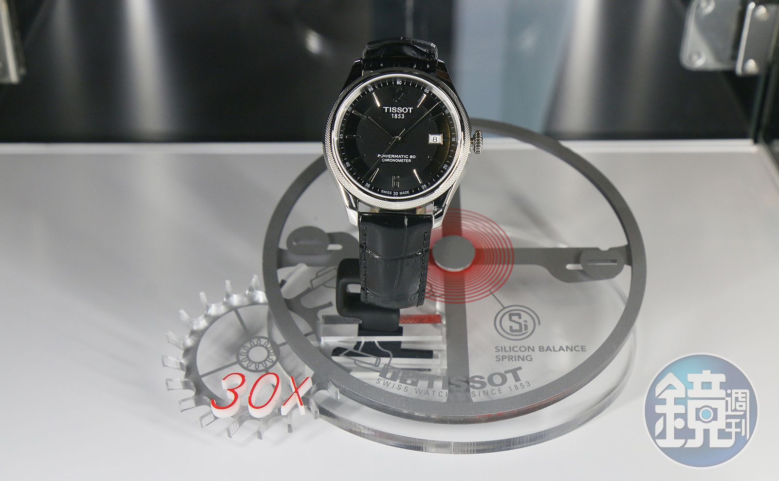 「防磁」,便是矽游絲最厲害的特色了。矽(Si)這種材質不受任何磁場影響,可是大幅降低了機械錶的受磁性。活動現場還有個特別的小遊戲讓媒體與貴賓們親身試驗,用一把受磁的鑷子去靠近一般的游絲,馬上就被吸住了;不過換作另一旁的矽游絲,可就絲毫不受影響。