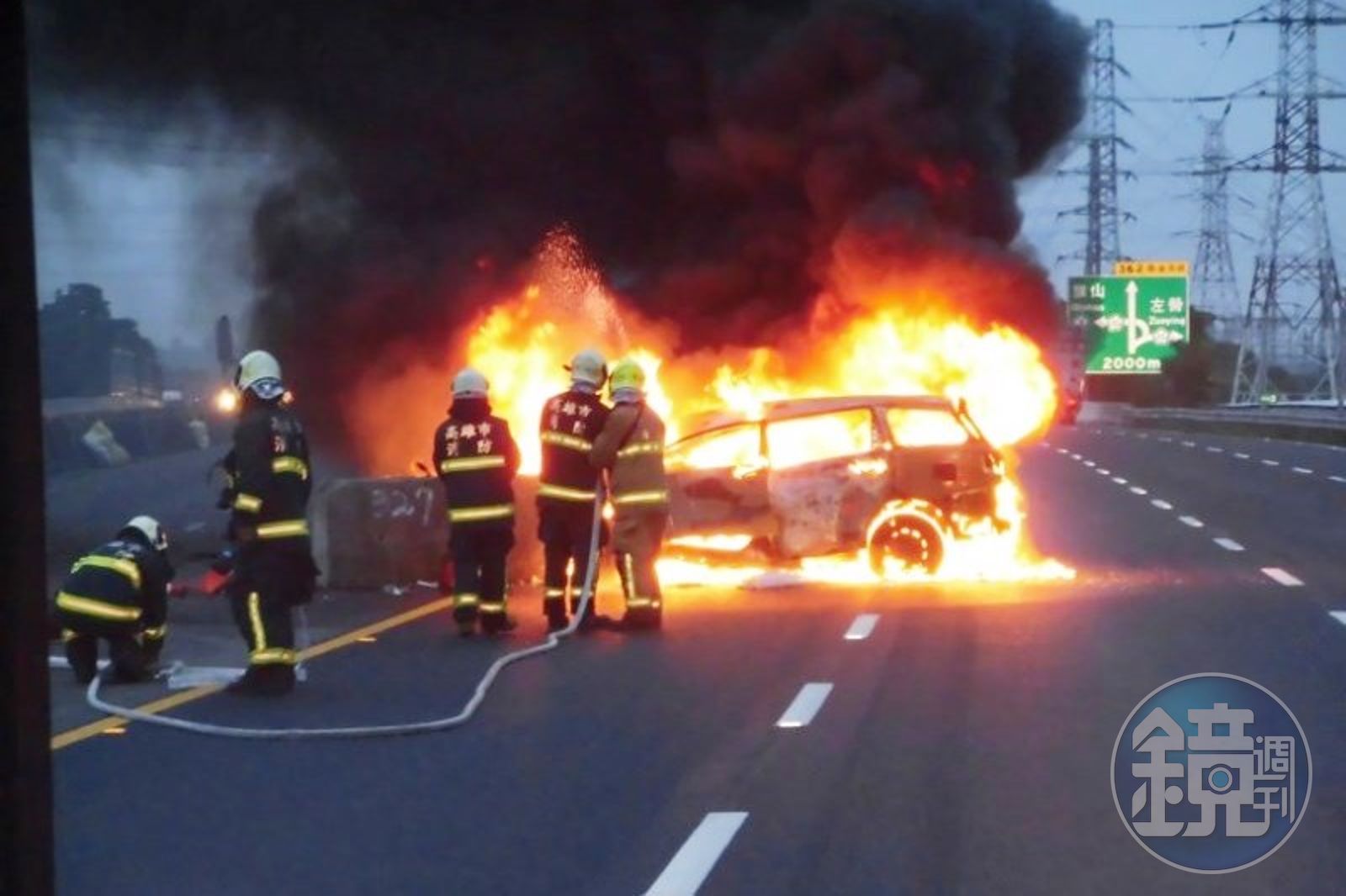 警消共出動6車16人於5時29分火勢控制,5時34分將火勢撲滅,當時發現車內除了一名駕駛以外,副駕駛座也有一人,當場被活活燒死。警方查出該車車牌登記為台北市車籍,車內駕駛疑似為陳姓車主的父親,副駕駛座死者為女性,疑為駕駛女友。