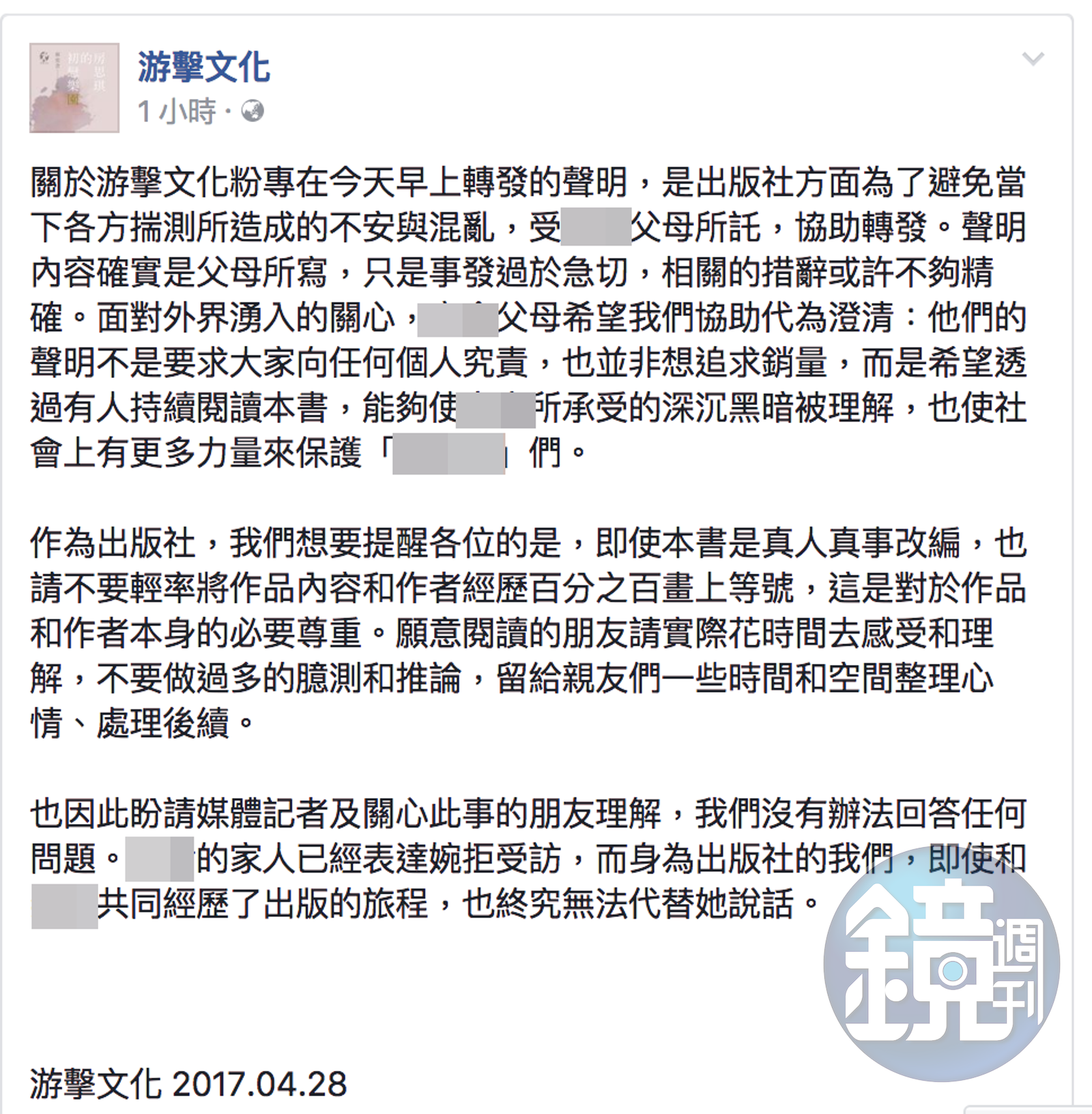 社會局表示已要求出版社下架聲明,而出版社也在臉書再度po文,指出會代發聲明是因為「為了避免當下各方揣測所造成的不安與混亂,受林女父母所託,協助轉發」,也強調「他們的聲明不是要求大家向任何個人究責,也並非想追求銷量」,而是希望透過有人持續閱讀本書,能夠使林奕含所承受的深沉黑暗被理解,也使社會上有更多力量來保護受害者們。
