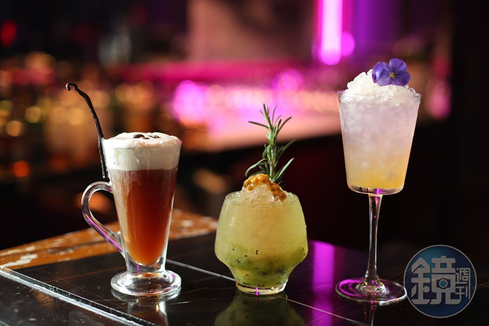 「這裡的血腥瑪麗是我一喝就愛上。」許若瑋笑說。以伏特加為底,一層層鋪上Tabasco辣醬、胡椒鹽,風味十分強勁爽冽,乍喝竟有如艾雷島的泥煤威士忌,原來煙燻味來自杯口烤得香脆的厚培根。在紫豔能喝到中式茶元素的創意調酒,如「鐵觀音Mojito」「凍頂烏龍Martini」,連餐點也由紫豔中餐廳行政主廚鄔海明設計,以精緻的中菜小食為主,好比以琴酒提香的豬後頸肉,以加了山葵芥末拌炒的骰子牛肉,東方與西方的餐飲概念在此交疊揉合出火花。