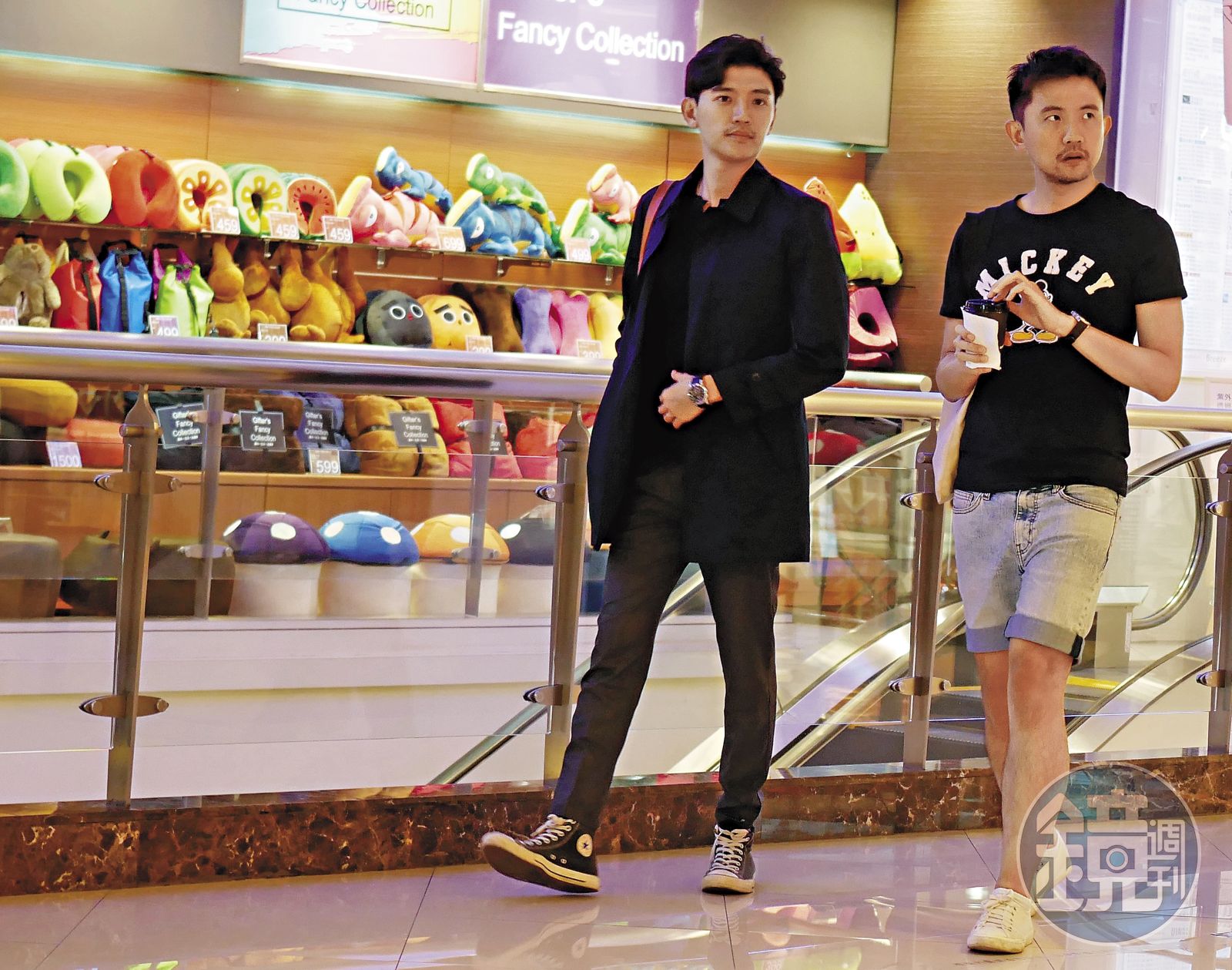 4月21日的晚間10點,本刊直擊曾少宗與1名男子現身在北市復興北路上的一間電影院,他們先去商場閒逛打發時間。該名男子耳朵尖尖,穿著一件米奇的T恤及一件牛仔小小短褲,看來別有一番古錐風味。
