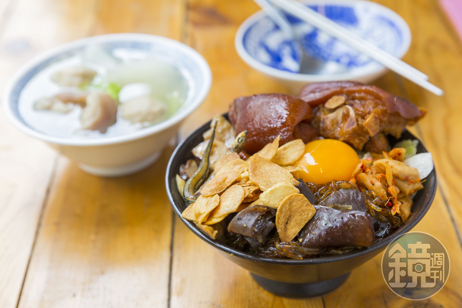 我戳破豬腳飯附的生蛋黃,拌著鹹甘滷汁入口,醇郁下飯,豬腳也滷得皮糯肉酥,據說是弟弟每天到市場採買的溫體豬,毫無豬羶味。古早味排骨則以自家調配的五香粉、醬油、胡椒等醃料醃漬,先炸後滷,麵衣吸飽滷汁很是夠味,再搭上自家油炸蒜片,白飯一口接一口,果然夠銷魂。