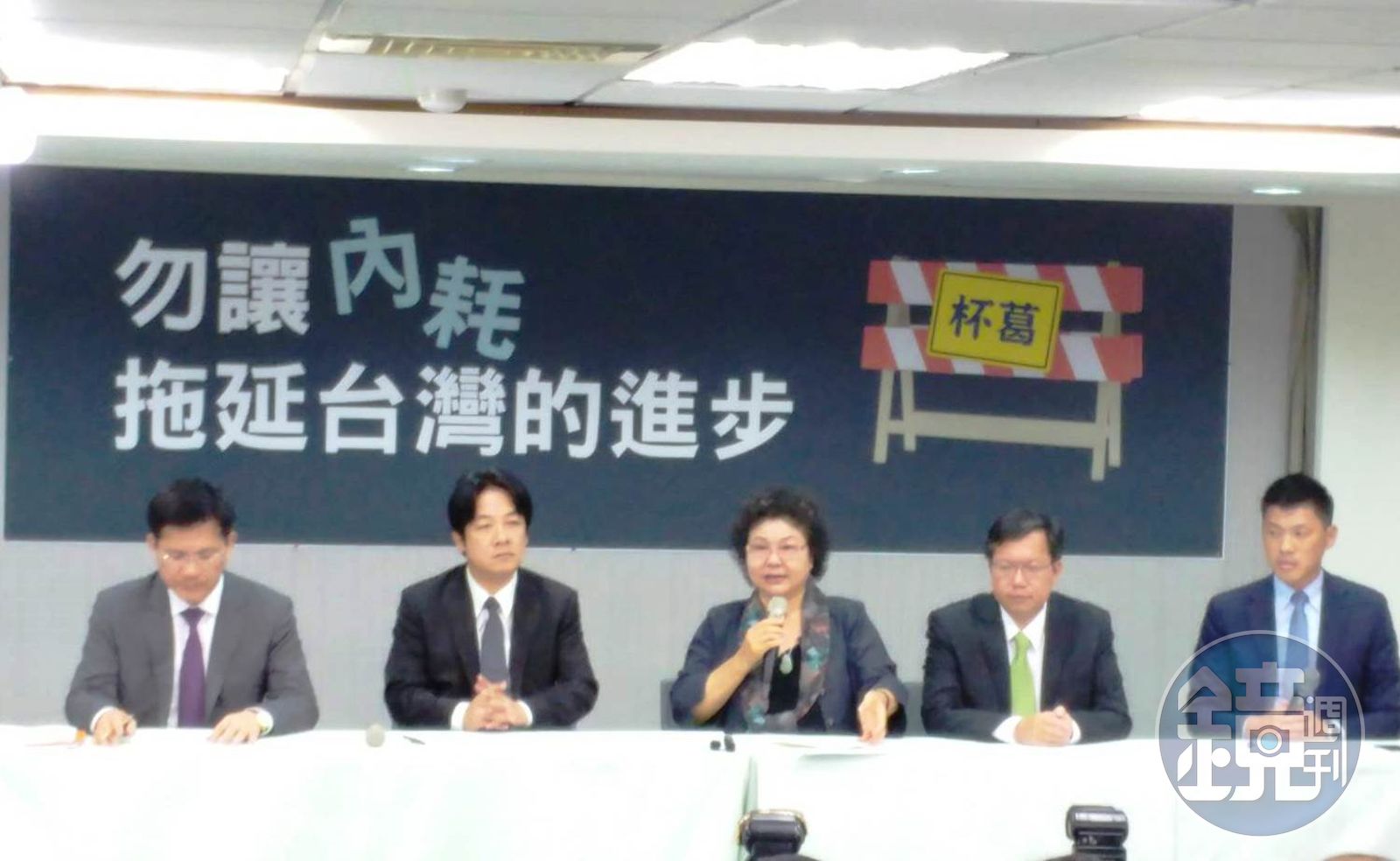 陳菊今天率綠營縣市長發表共同聲明,呼籲在野黨停止杯葛,下午陳菊更在台南市長賴清德、台中市長林佳龍、桃園市長鄭文燦等直轄市長陪同下,舉行記者會,宣示力挺前瞻計畫的決心。