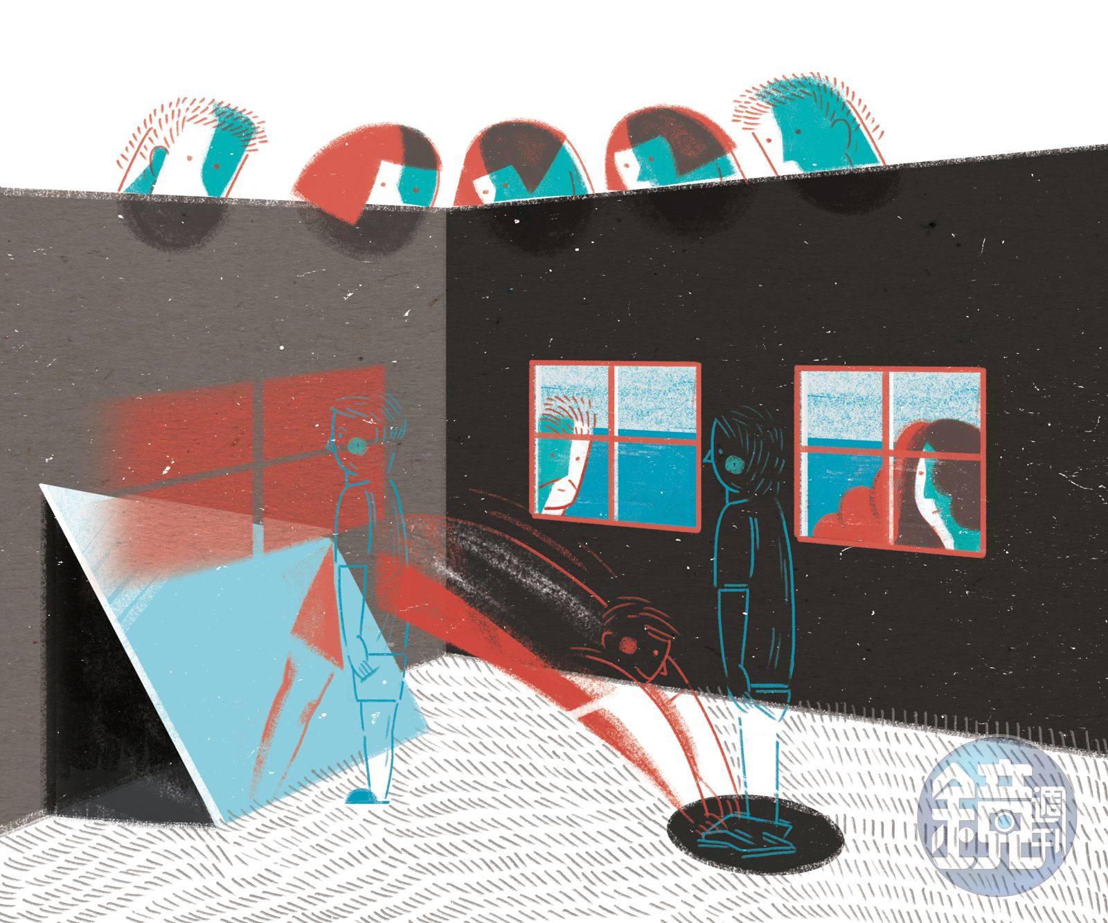 「你不應該這樣子,必須讓其他人知道你不好惹。」父親站在身後,眼神穿過我,彷彿鏡中和現實的我,都不是真實的,「眉頭皺緊一點,試著瞪向前面。」