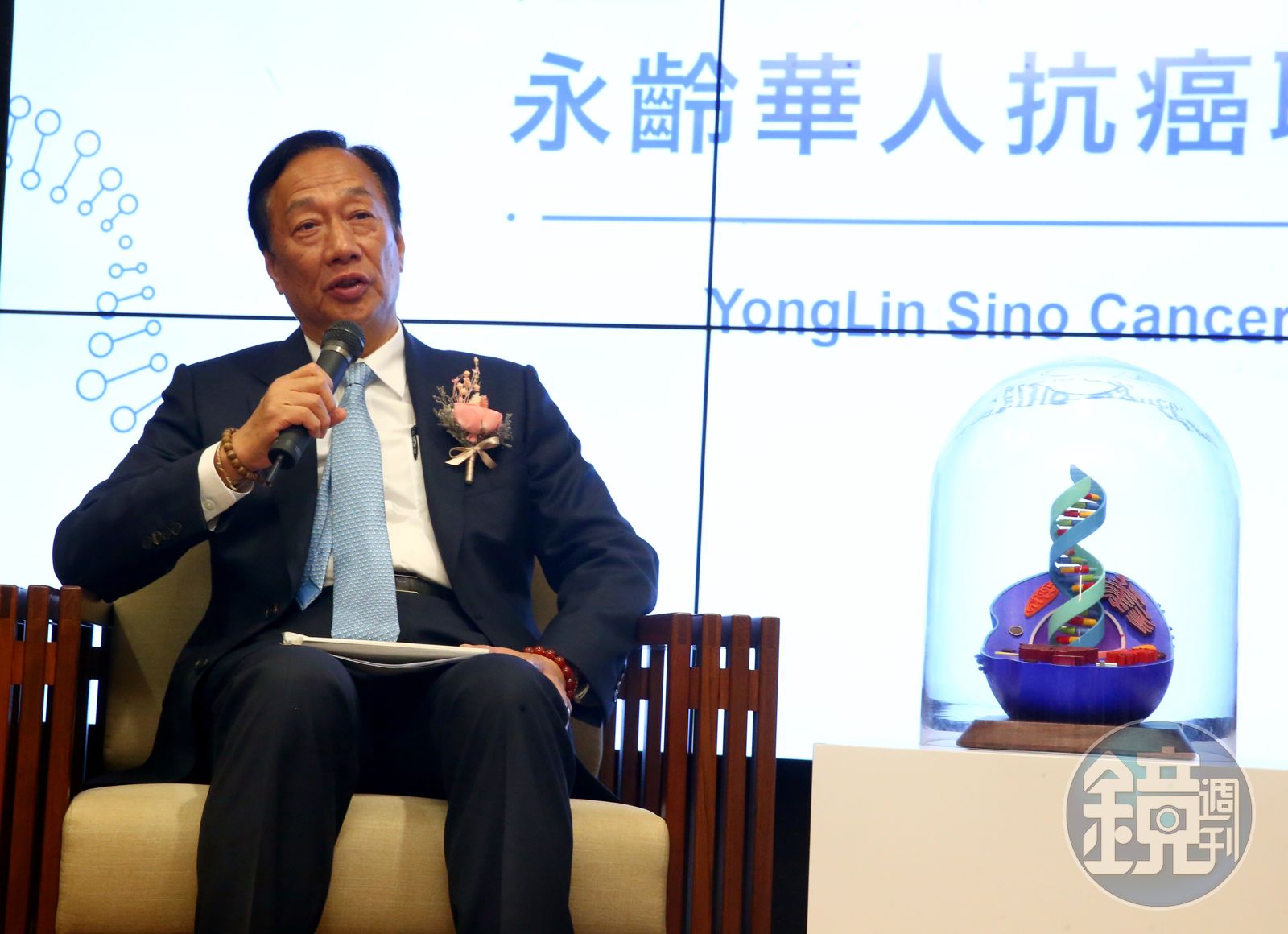 郭台銘指出,乳癌跟血癌一直是他終生難忘的痛,尋找全世界最頂尖的高手,結合科技、醫界高手一起來對付抗癌,讓癌症不再成為破壞家庭的兇手及健康的殺手,最終讓癌症逐步變成慢性病,甚至有機會變成罕見疾病,是他的夢想。
