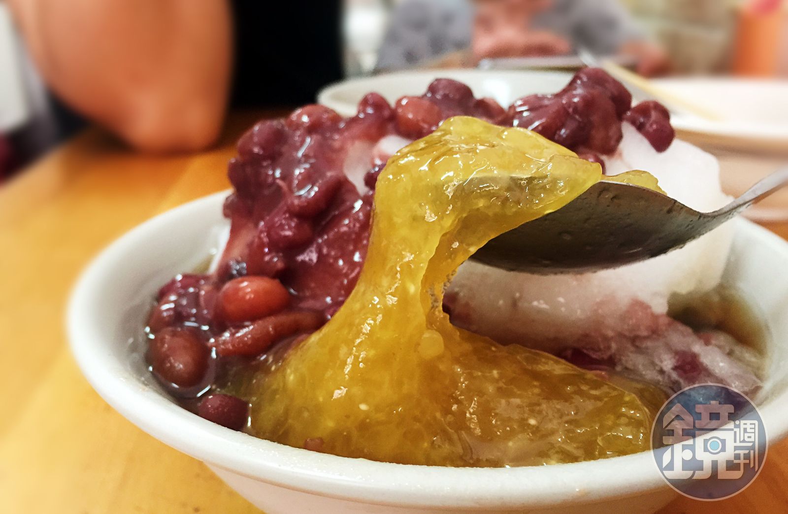「粳粽都是我們每天現做的,我們的紅豆也很好吃喔!」老闆娘瞇眼笑著補上這句,腦波弱禁不起推坑的我:「那,再幫我加紅豆好了。」多淋這一匙,風味果然加倍,這裡的紅豆是紅豆與花豆綜合,熬煮得鬆軟綿密,花豆增加沙沙的清甜口感,更添古早味。透亮的粳粽口感類似粉粿,配上蜜香紅豆與雪白清冰,Q黏順滑,一碗毫不費力的下肚。