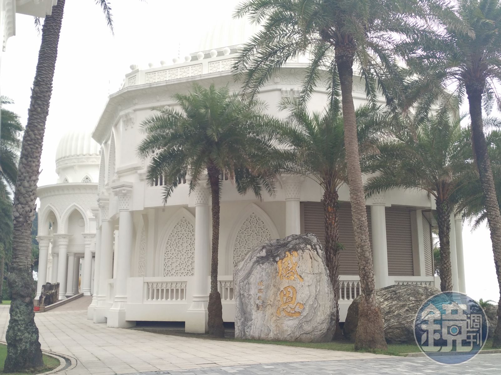 走到宮殿入口,高3、4公尺的大門敞開,映入眼簾的是一望無際的大海,一旁還有從阿拉伯引進的海棗樹,要進入宮殿前,門口有一個大石塊,上頭刻印著「感恩」二字,據了解,這是宮殿主人林昭文感念自己在阿拉伯發跡,因此特別設立;大門右手邊還有占地300坪的2層樓古典蘇州庭院建築,被命為「桂蓮園」,是林昭文以妻子之名所建。