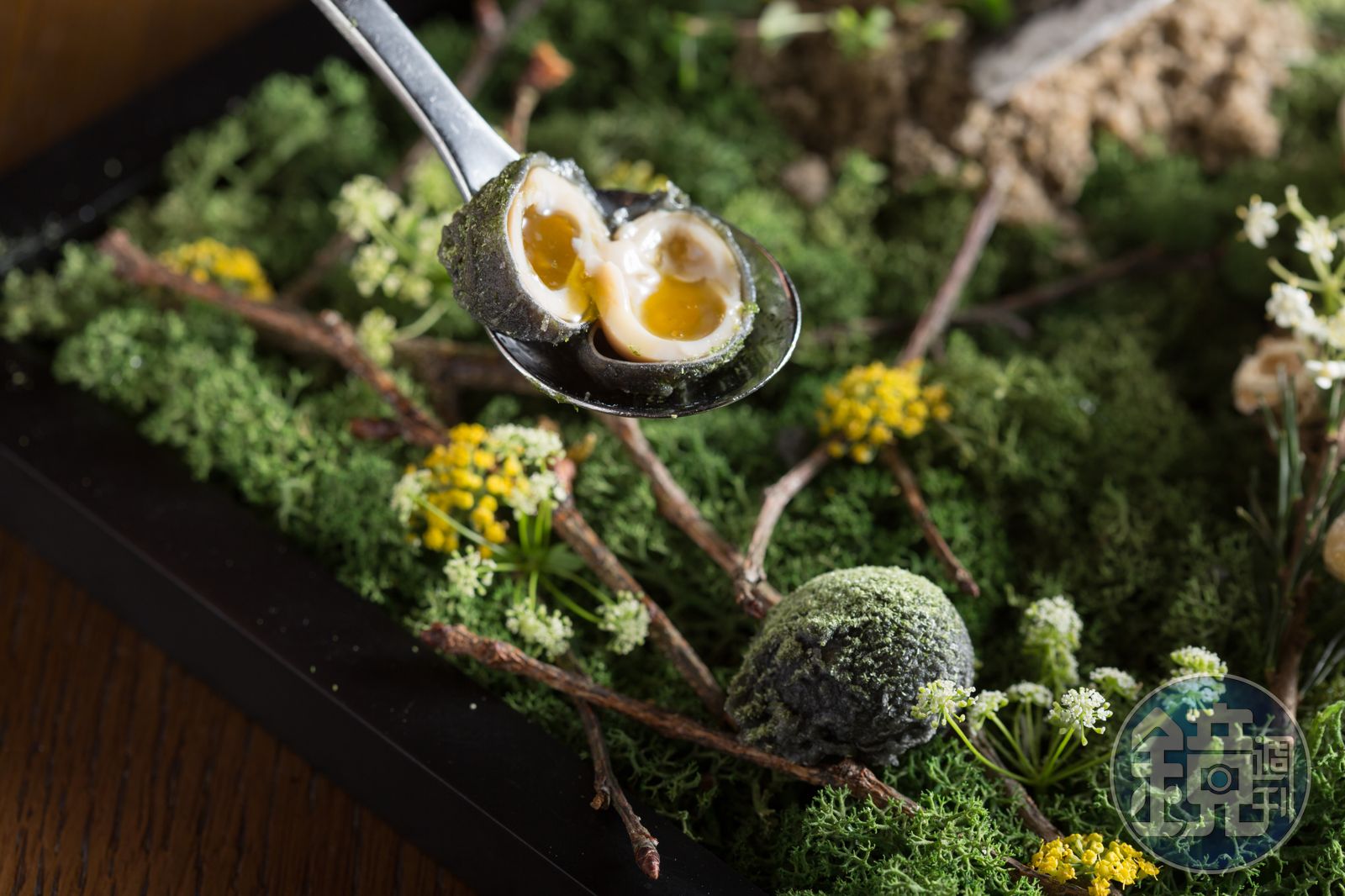 另一位靈魂人物,是去年「Diageo World Class」台灣區冠軍、調酒師Nick,他這次不用紅白酒,而以「Cocktail Pairings」方式佐餐,玩出餐酒搭新意,Nick說:「調酒的酒精濃度可以自訂,風味酸甜多變,更適合餐酒搭。」更令人驚喜的是,調酒不以單杯呈現,而是融於盤飾,好比「荷葉露珠」調酒靈感來自Alex和財哥端出的沙拉,蘊含大地恩賜及清爽口感,於是Nick選用帶有玫瑰花和小黃瓜香氣的琴酒,再加入柚子,用分子料理手法把酒液製成一顆淡綠色晶球,再以蓮葉輕輕托住,一如大地露水。
