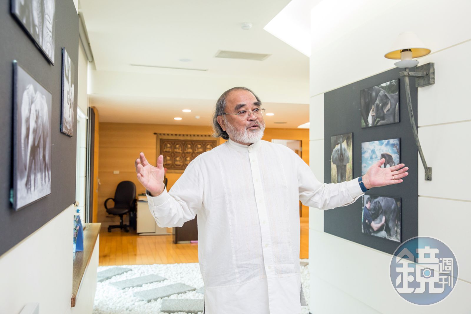 「這些大象是我們的企業標誌,象徵幸福圓滿」「牆上的照片是要提醒我,沒有員工就不會有這間公司。」林泰生一邊說明辦公室的擺設,一邊介紹自己的兒女讓我們認識。