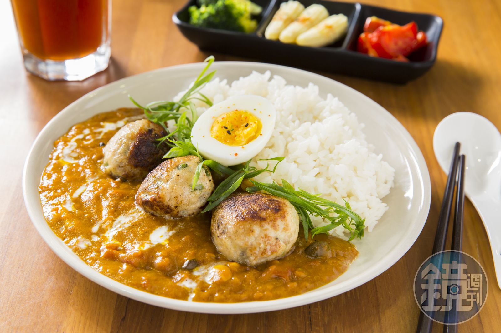 我很喜歡期間限定的「手工雞肉丸搭配番茄咖哩」,圓圓胖胖的肉丸是由帶油脂的豬里肌混合雞柳肉手工捏製而成,多汁不柴,至於多吃幾口容易生膩的擔憂便是多慮,原因就在丸子裡包進了祕密武器「菜脯」,添了脆又提了鹹,加上糯米椒助陣,風味更加清爽。女友Rigel笑說:「你也知道,西餐很喜歡玩層次的。」的確,這結論下的挺妙,西式料理特愛強調的層次,都濃縮在這一顆肉丸子裡了。