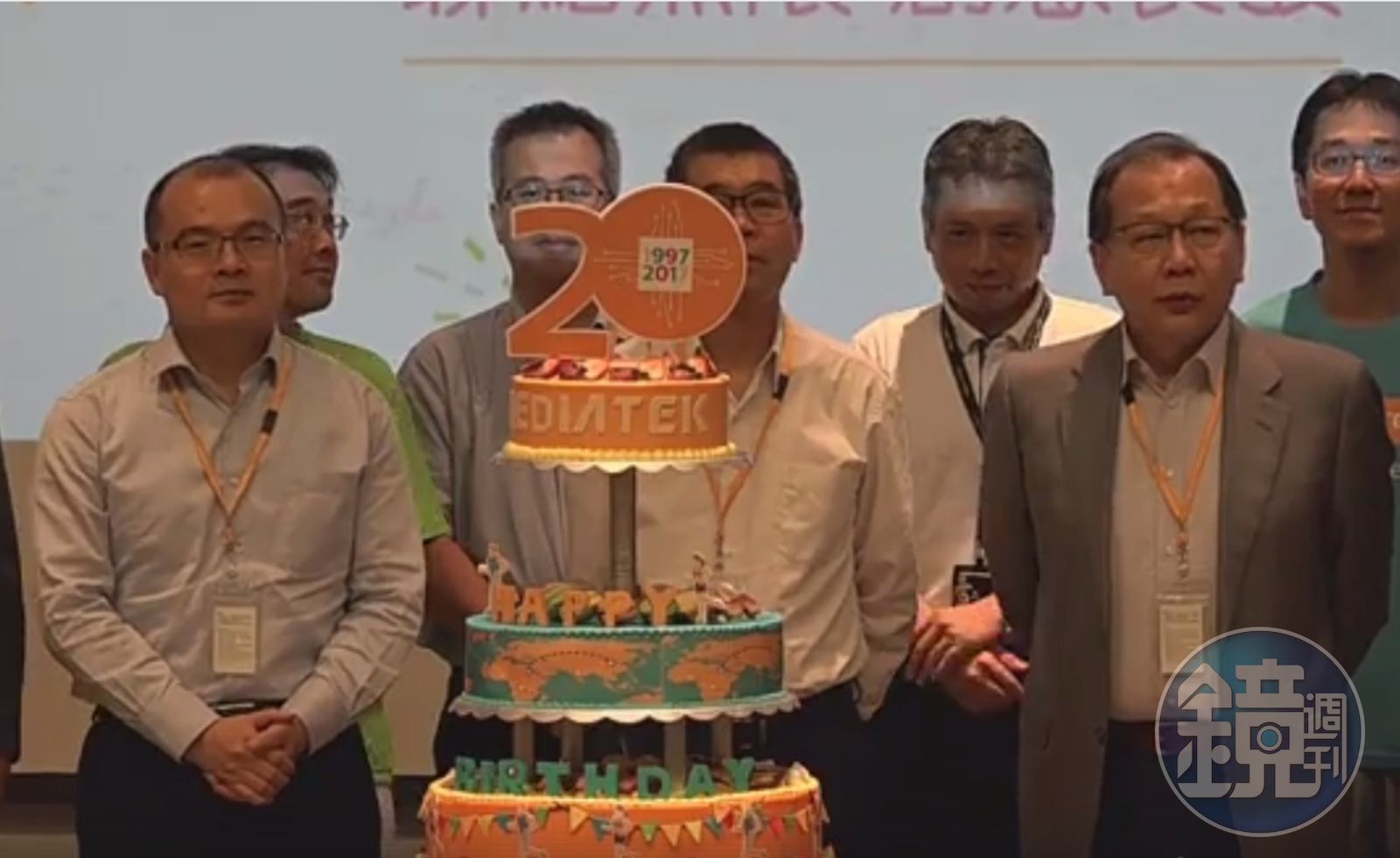 聯發科今天在新竹總部舉行20週年慶,包括台積電董事長張忠謀、日月光營運長吳田玉等人均透過影片獻上祝福,此外,聯發科董事長蔡明介以及新任執行長蔡力行、副董事長謝清江等人一起上台切蛋糕。