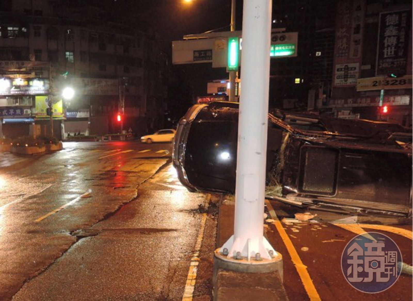 今天凌晨1時許,台中市第三分局健康派出所獲報,指南區五權南路與高工路口,有1部小客車疑因車速過快,轉彎時自撞安全島翻覆,員警趕抵現場,車上卻未見駕駛人,但旋即發現38歲的詹姓男子坐在距翻車處30公尺處的路邊,眼神呆滯,一語不發。