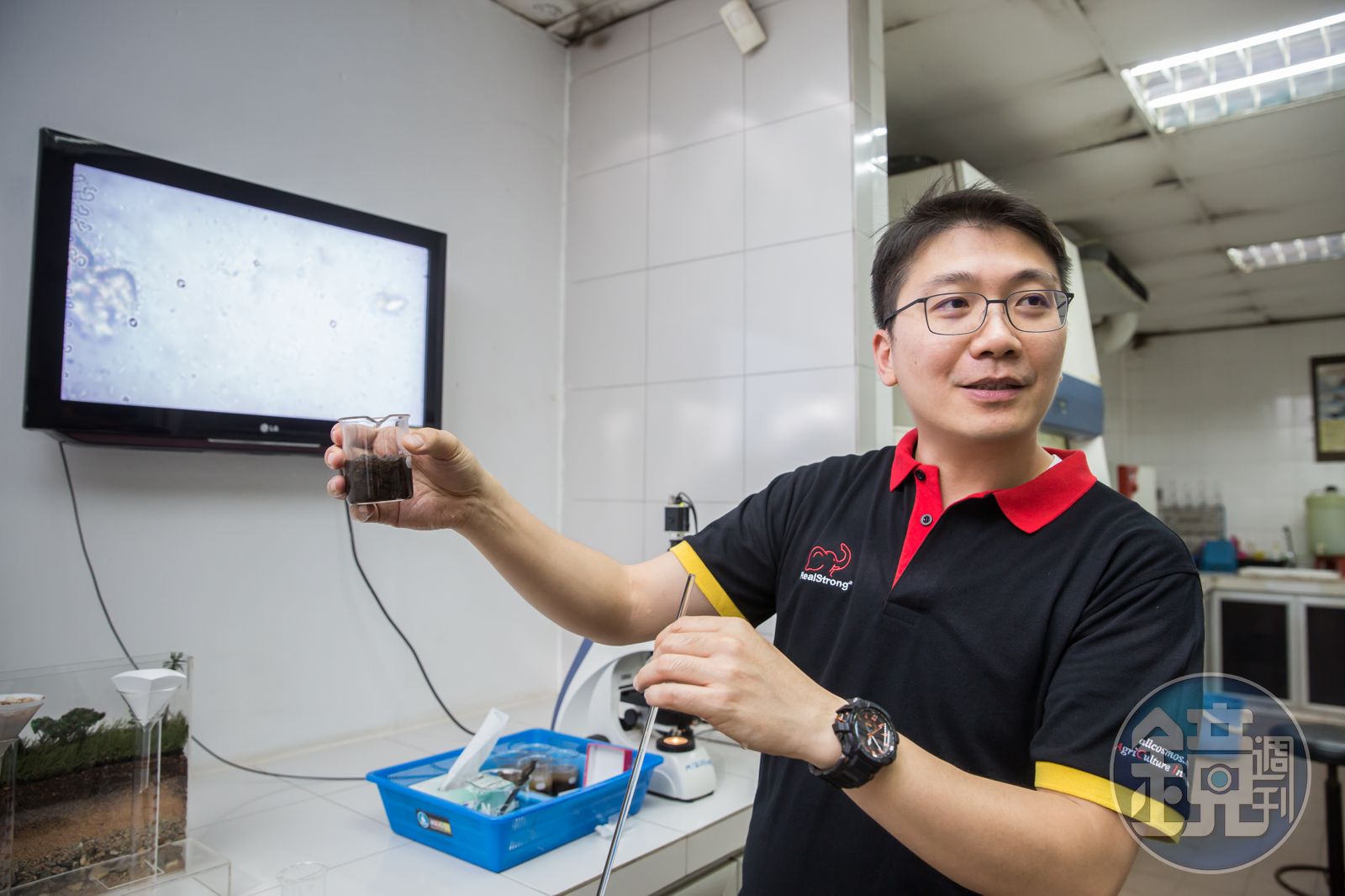 場景換到實驗室,「你一定沒看過肥料是活的!」彭士豪把自家產品放在顯微鏡下顯影,只見一條條生命力旺盛,猶如蟲在游的微生物,「一般化學肥料是死的,顯影下只有結晶體,我的肥料裡含有內生真菌,能附在油棕的根系上,使樹根腐爛的病害真菌進不來,對人無害,另一方面,農民發現買我的肥料就能減少買農藥的錢,作物產量還比一般化學複合肥料多1到1.2倍,效益就高起來。」
