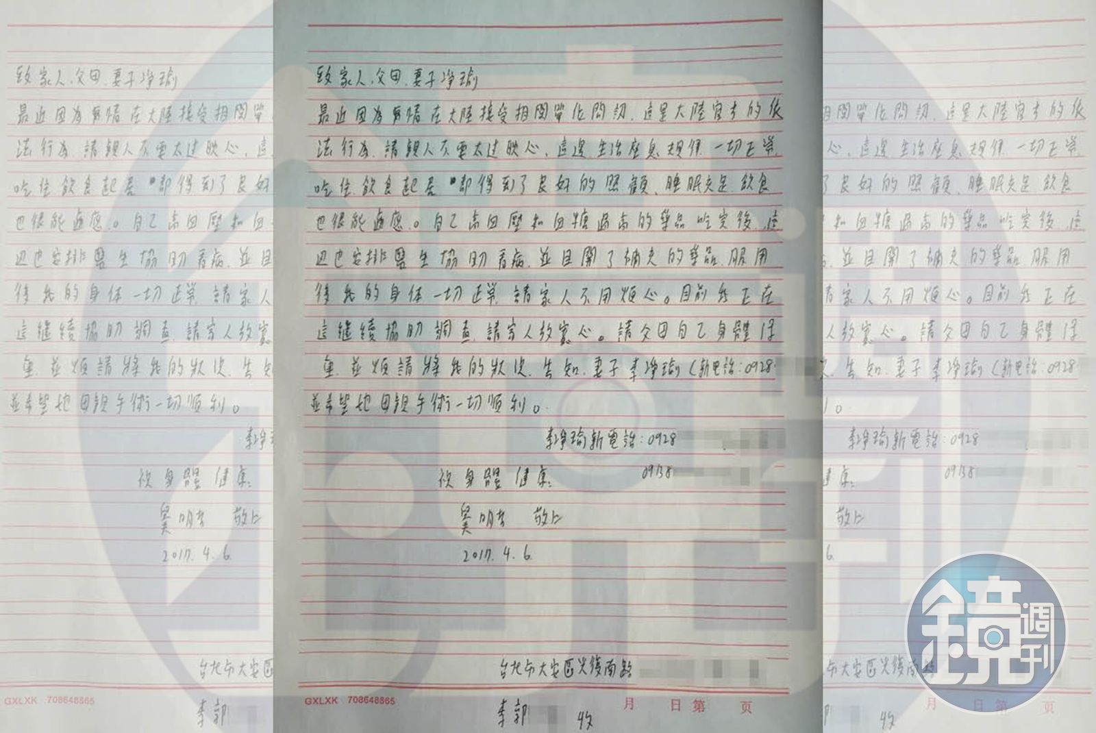 最近因為事情在大陸接受相關單位問訊,這是大陸官方的依法行為,請親人不要太過耽(擔)心,這邊生活座(作)息規律,一切正常,吃住飲食起居都得到了良好的照顧,睡眠充足,飲食也很能適應。自己高血壓和血糖過高的藥品吃完後,這邊也安排醫生協助看病,並且開了補充的藥品,服用後我的身體一切正常,請家人不用煩心。目前我正在這繼續協助調查,請家人放寬心。請父母自己身體保重,並煩請將我的狀況,告知妻子李凈瑜(新電話0928XXXXXX),並希望她母親手術一切順利。