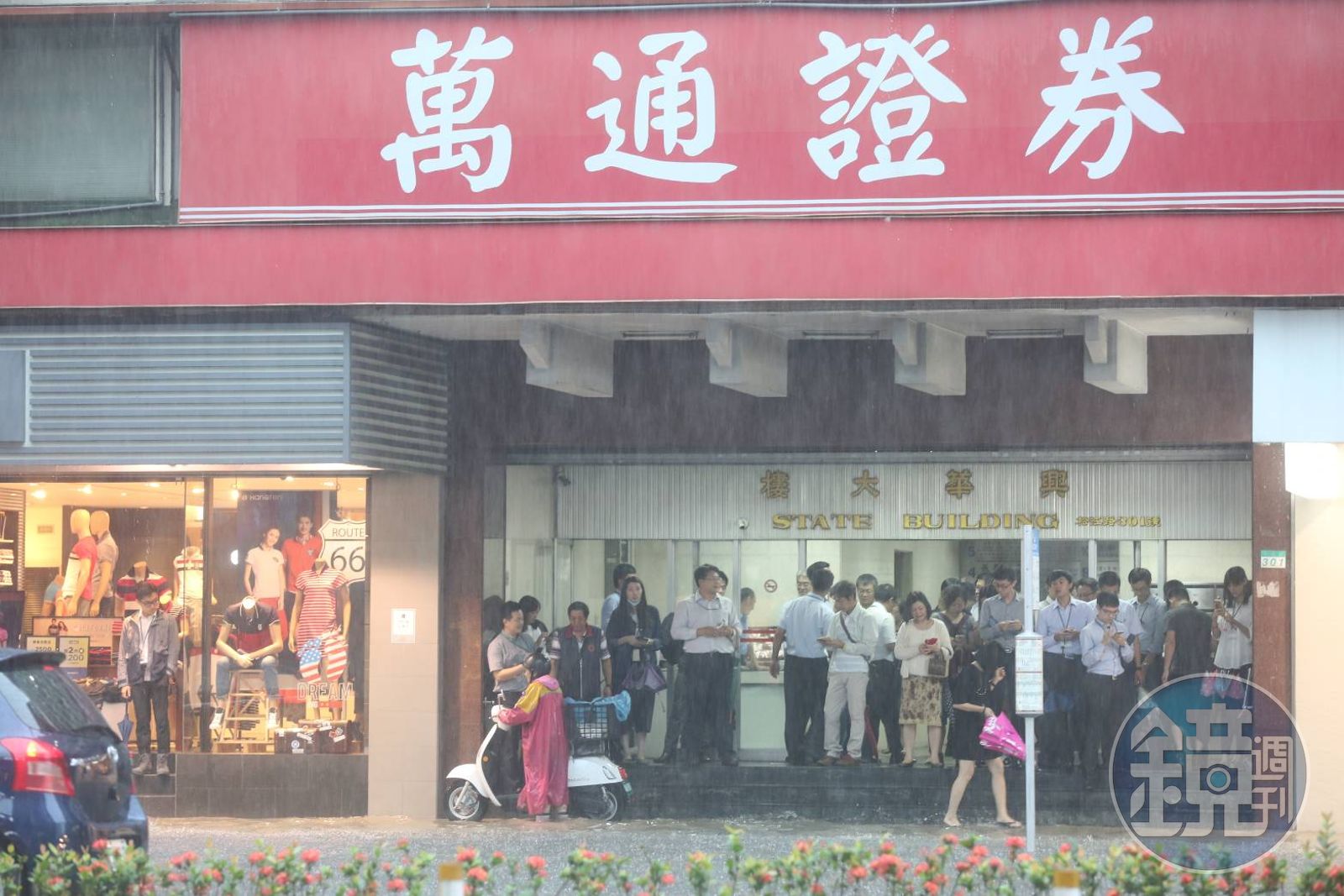 北台灣一早就陷在大雨中,許多路面積水,不少出來辦事的民眾只在待在騎樓下避雨。