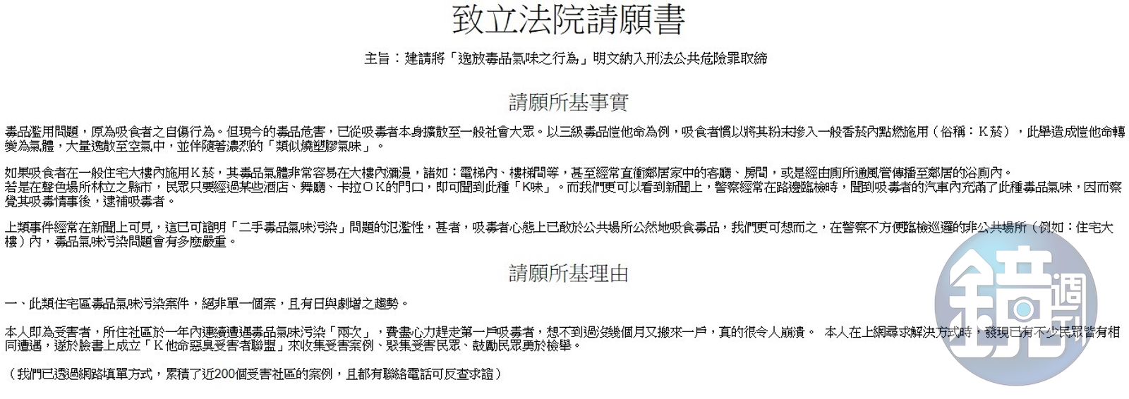 而請願書在去年8月底由法務部回覆給小鍾,內容卻是牛頭不對馬嘴,僅列出刑法190-1條「若投棄、放流、排出或放逸毒物或其他有害健康之物,而污染空氣、土壤、河川或其他水體,致生公共危險者,處5年以下有期徒刑」,並在後方強調「若個案情形符合,自可依法處罰」,把問題丟回給遭毒害的住戶本身來煩惱。