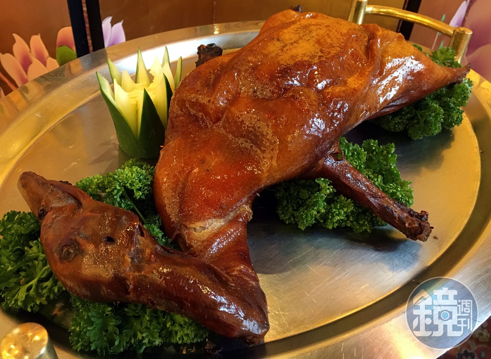 「天成大飯店TICC 世貿會館」的烤鴨之所以頗受好評,是因為主廚特選宜蘭3公斤以上的肥美櫻桃鴨,以掛爐烘烤的手法製作,精準掌控火候,讓鴨皮喀滋酥脆,肉質卻依舊嫩甜,搭配自製的麵餅皮,刷匙甜麵醬、夾上青蔥,滋味更有層次。