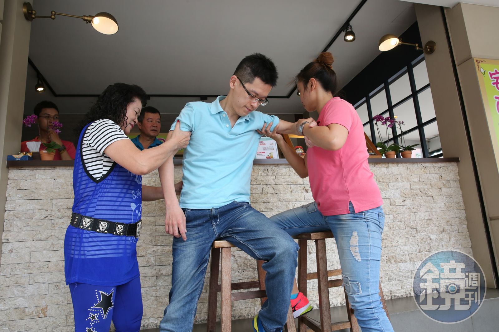 她見到攝影機,先是閃躲,隨後害羞地說:「過去幾家媒體來採訪他們,想問我看法,我攏歹勢,也不想曝光,因為不習慣在鏡頭前面說話。今天既然這麼巧,就幫我和他們倆拍張照吧。」