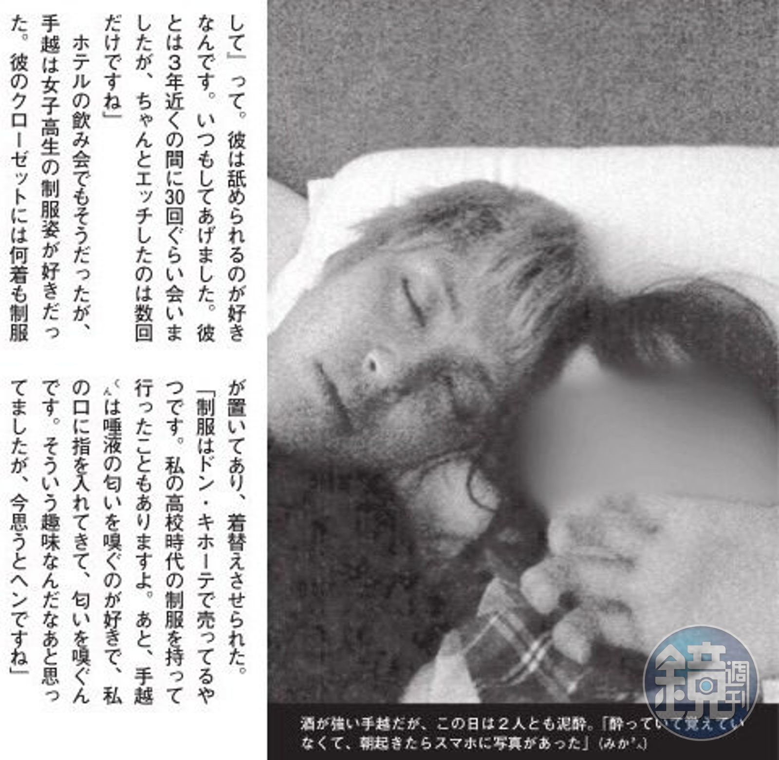 據聞,手越祐也除了熱愛女性把手指伸進嘴裡之後拿出來,猛聞手指的味道,也偏好女生去廁所醉吐回床上之後,就直接跟人家大搞特搞。對此日本八卦網站《CYZO》找AV從業人士進一步分析,其實這比單純的「口水性癖」更不常見及深不可測。
