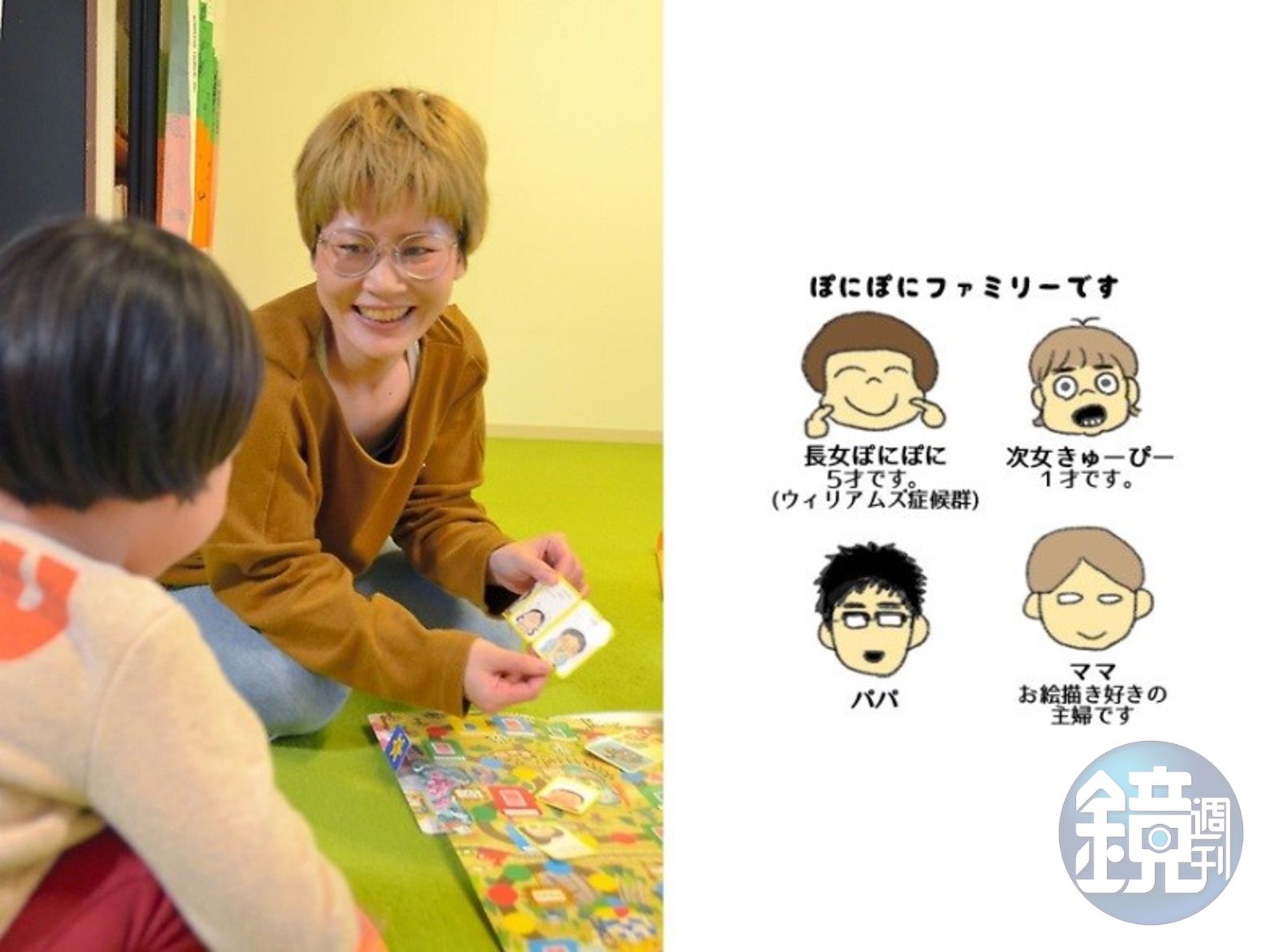 從她的部落格可以看到:女兒因為很怕吹風機的聲音而不想吹頭髮的樣子;拼圖時由於看不到整體只看得到部分,對著叫她「想像整體」的父親生氣地回答「我想像不出來」的樣子等等威廉氏症的特徵場面;此外還有家人之間平日的互動等,皆以一篇一到10格的漫畫來介紹。