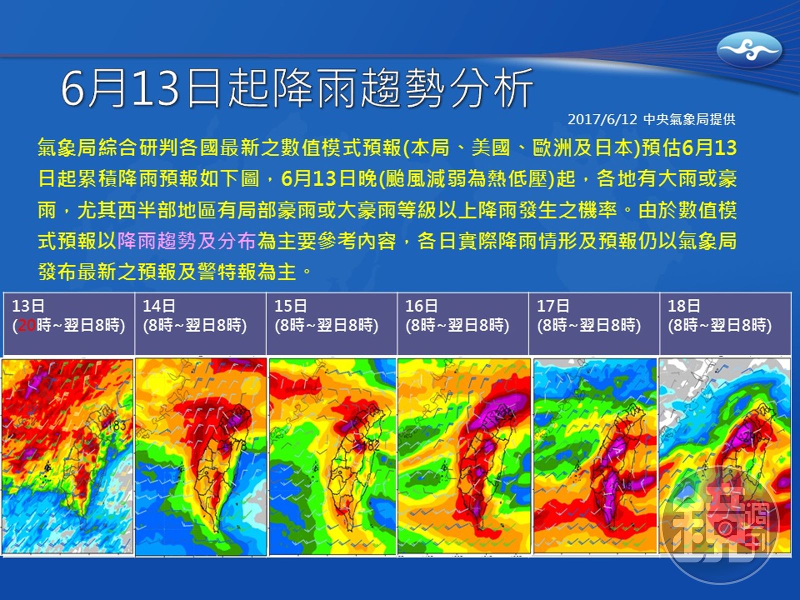 氣象專家吳德榮分析,從週三起的第二波典型梅雨鋒面,將在台灣附近南北徘徊,伴隨西南氣流增強與減弱的變化,局部地區會出現劇烈的天氣伴隨大量降雨,持續時間將到下週二。