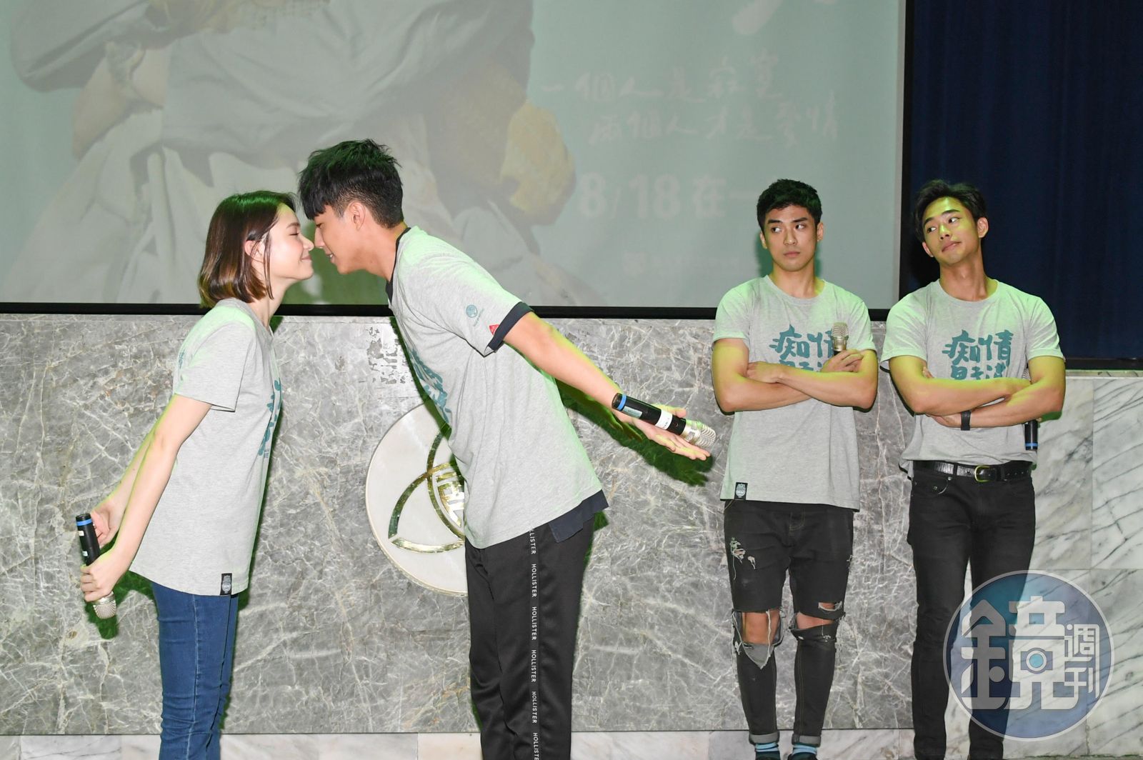「男子漢返校日」現場也讓蔡凡熙與韓笙笙示範演技大考驗,兩人互磨鼻子十秒,雖然兩人在《痴情男子漢》有激吻戲,蔡凡熙說:「因為殺青有陣子了,現在磨鼻子有點小尷尬。」