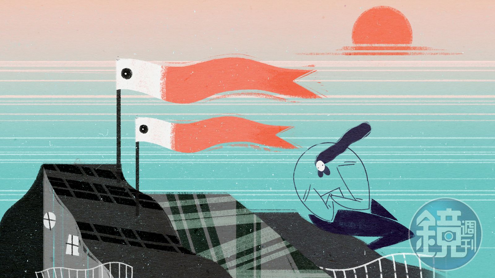 竹竿上的鯉魚旗和正讀著明信片的你