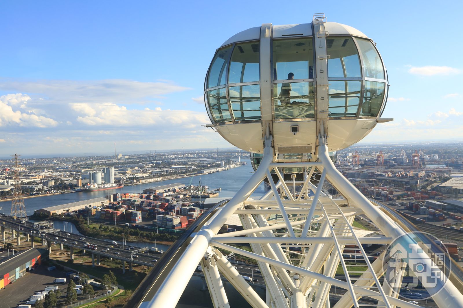 買一杯澳洲式Flat White咖啡,搭著鏗鏘作響的路面電車,從中央商業區(CBD)悠哉來到位在港區的「墨爾本之星觀景輪」。從數字上看,這個地標摩天輪自2008年啟用,是南半球最大、世界第3大的摩天輪。最高處120公尺,約38層樓高,共有21個寬敞的有空調的玻璃車廂。