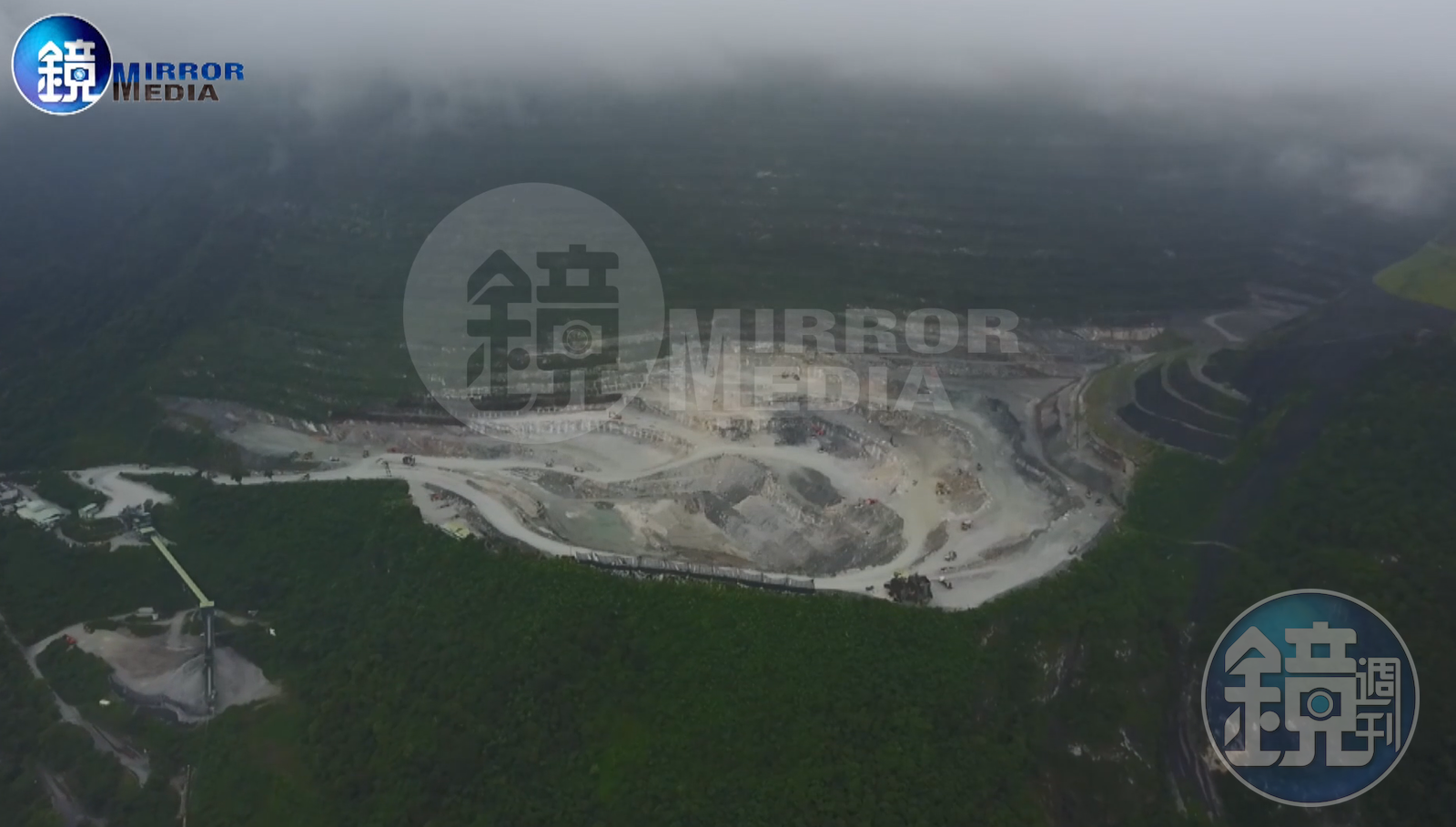 本刊取得亞泥礦場的空拍影片,當空拍機往新城山外俯瞰時,可清楚看到經過數十年的採礦,新城山已經從原本的海拔700多公尺減為不到300公尺,再往前飛行更可清楚看到,外表翠綠的山坡後方竟是一大塊凹洞,這就是齊柏林導演感嘆挖的更深的區塊,後方的山坡雖然已經復育,但仍清楚可見階梯狀的挖掘痕跡。