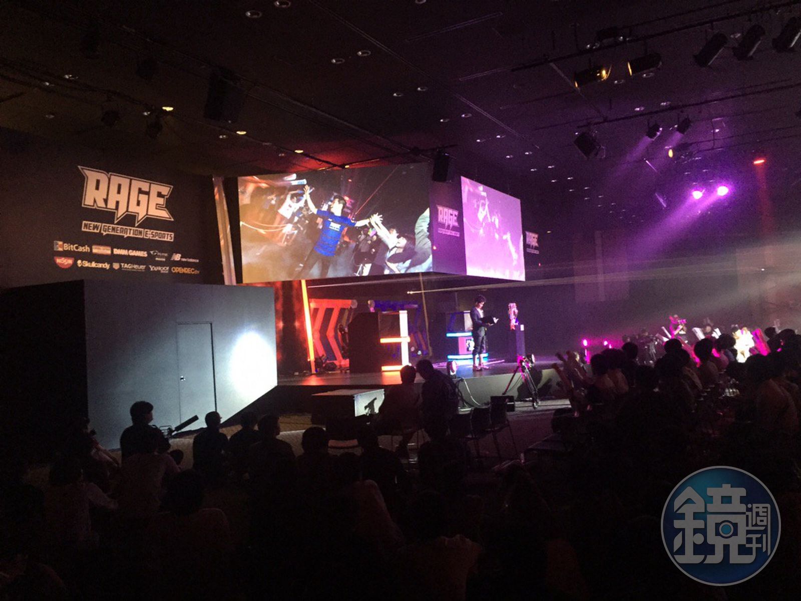 第4屆的「RAGE」總決賽在本月10號舉辦,這次總共安排了《闇影詩章》(為Cygames旗下的卡牌遊戲)、《快打旋風 V》與《世界足球競賽2017》三款遊戲做為比賽項目。會場布置以黑色為基調,打上紅色與藍色的燈光,充分展現對抗與科技感。在黑暗的會場裡,觀眾的視線移動強烈依靠投放螢幕和聚光燈光線,這對於主辦單位接下來要做的事非常重要,因為接下來,將是一連串的表演秀。