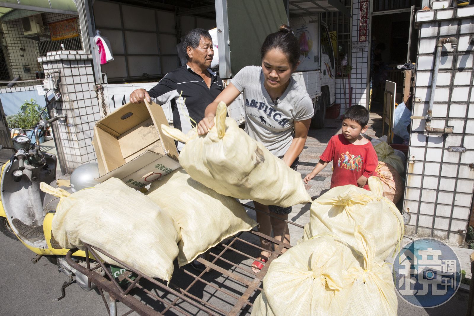 大男人都做不到的事情,她一肩扛起。20公斤重的小孩、50台斤重的地瓜、一個月7千元的房租、一家三口的生計,兩個孩子的媽,也是菜市場裡的神力女超人。