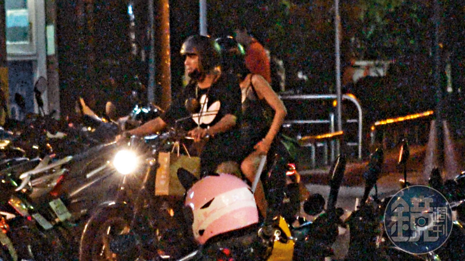 凌晨將近2點,嘎嘎和新妹走出電影院,也許是夜色已深,2人也逐漸放下心防,一同走向停車區,還不忘在摩托車旁打情罵俏、磨磨蹭蹭,隨後女方有點不甚優雅地爬上了嘎嘎的摩托車,由於是跨坐,她每次坐上車,都要先撩一下裙襬,並露出細白大腿,姿態還是隱約透出性感本色。