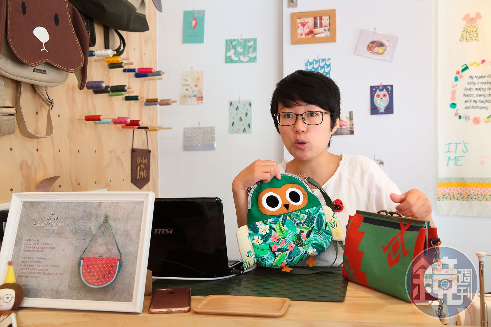 分秒必爭的二人介紹完,繼續「黏」回位置上,熟練地揮灑手上的一針一線,縫著花俏辣椒紅底布的松鼠,留白的大圓臉,有著嬌小身軀,搭配彎胖尾巴,逗趣可愛,Michelle說:「好忙喔!台中客人昨天突然要買三個…」Sanford則在旁包裝準備寄出的零錢包。