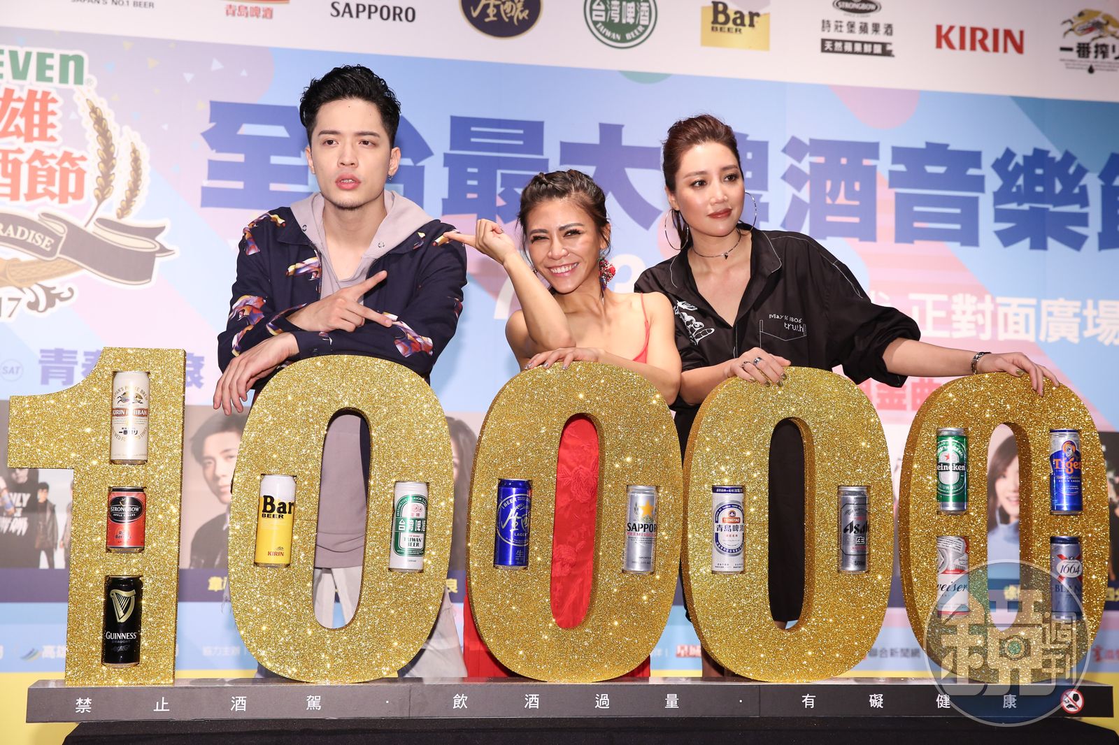 A-Lin(右起)、艾怡良、J-Sheon同門師姊弟攜手出席啤酒節記者會,新科歌后艾怡良喜上眉梢。發布時間:2017.06.28 17:12 臺北時間